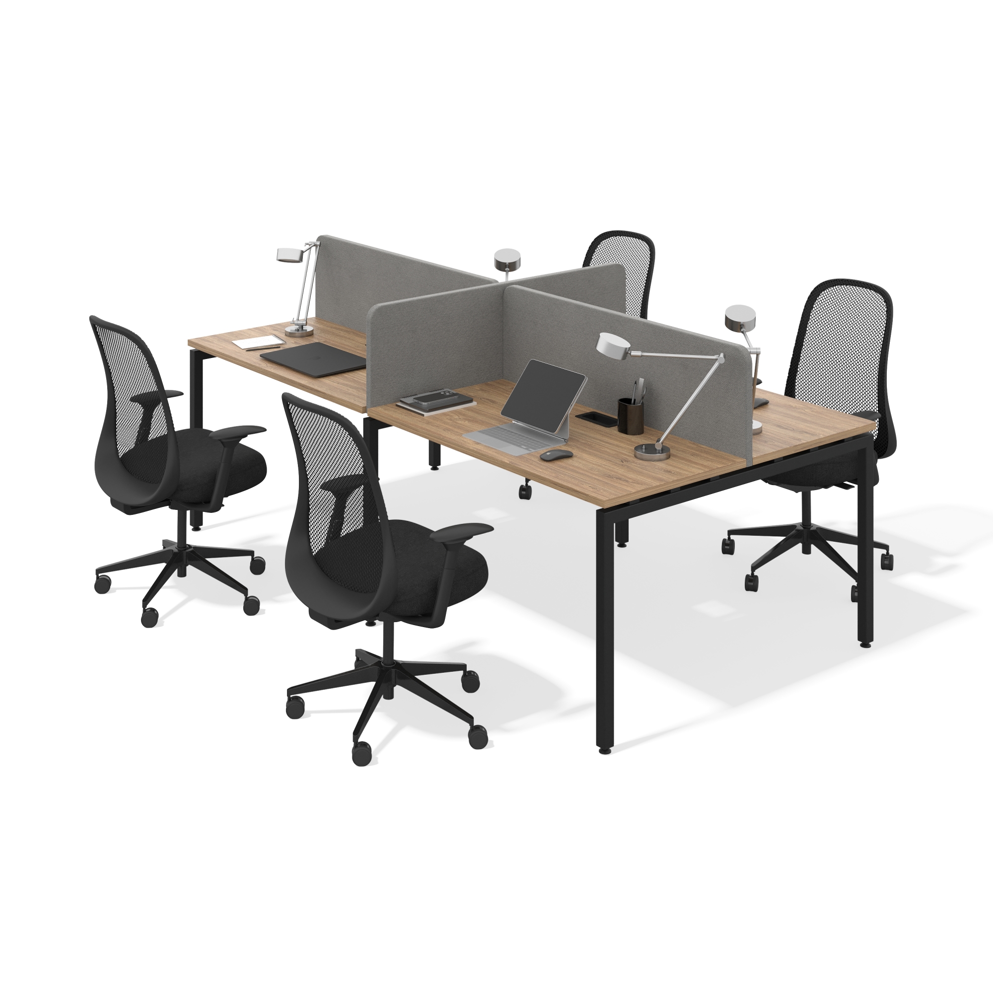 Бенч-система для офиса на 4 рабочих места. Металлический каркас обеспечивает необходимую прочность и долговечность. Благодаря особому порошковому покрытию металла, его поверхность не подвержена царапинам. Каждое рабочее место можно оснастить необходимым дополнительным оборудованием: кабель-каналами для проводов, ящиками для хранения документов, полками, лючками для проводов, а также различными аксессуарами: креплениями, зажимами, крючками для сумок, подкатными платформами для системного блока ПК.