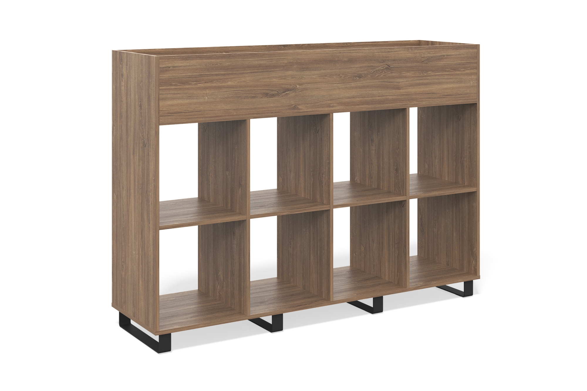Стеллаж с открытыми полками для храненения и кашпо для цветов.