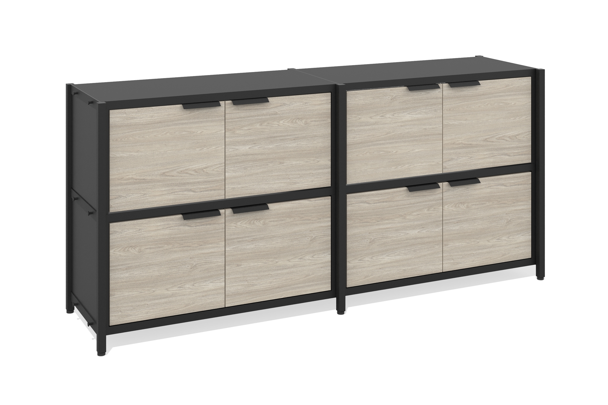 Стеллаж низкий 2 секции (Два уровня с дверцами, Фасад: натуральный шпон (дуб), Корпус А: черный графит, черный муар)