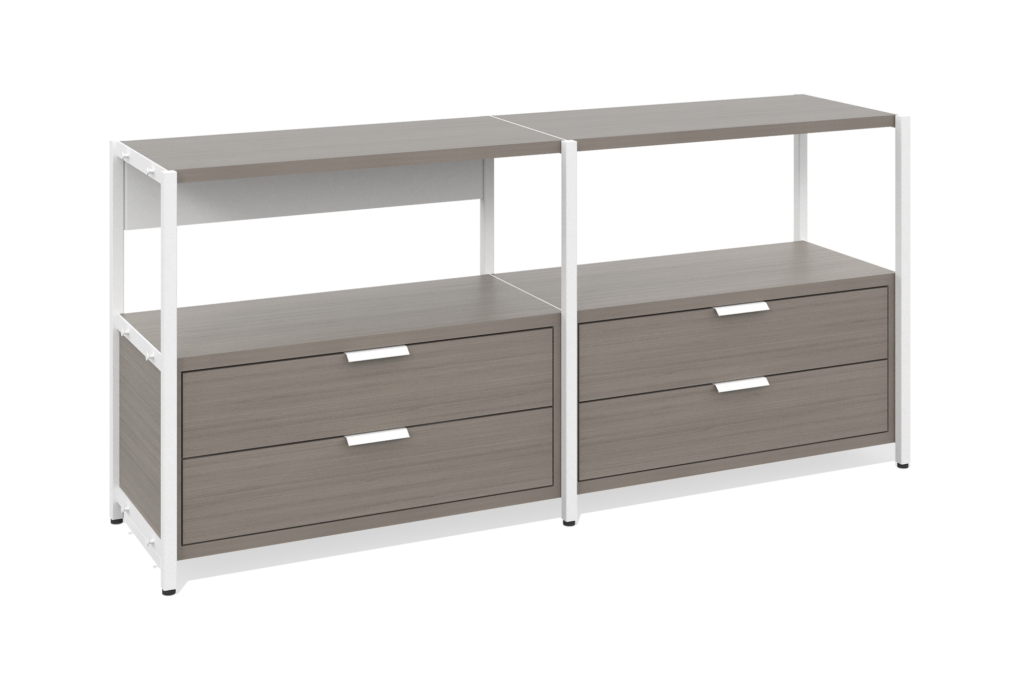 Стеллаж низкий 2 секции (Один уровень с ящиками, Фасад: файнлайн средне-серый, Корпус А: файнлайн средне-серый, белый муар)