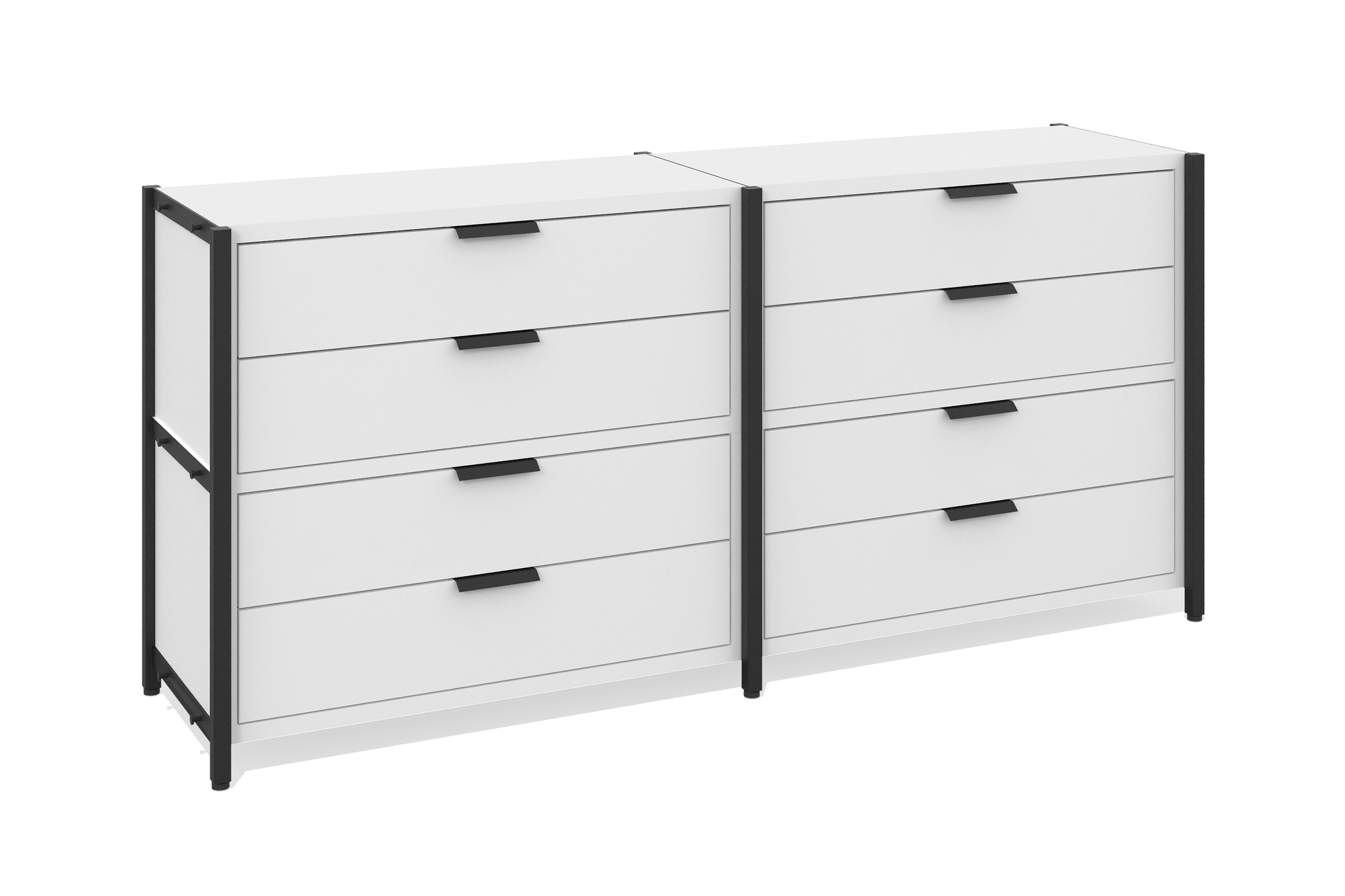 Стеллаж низкий 2 секции (Два уровня с ящиками, Фасад: белый премиум, Корпус А: белый премиум, черный муар)