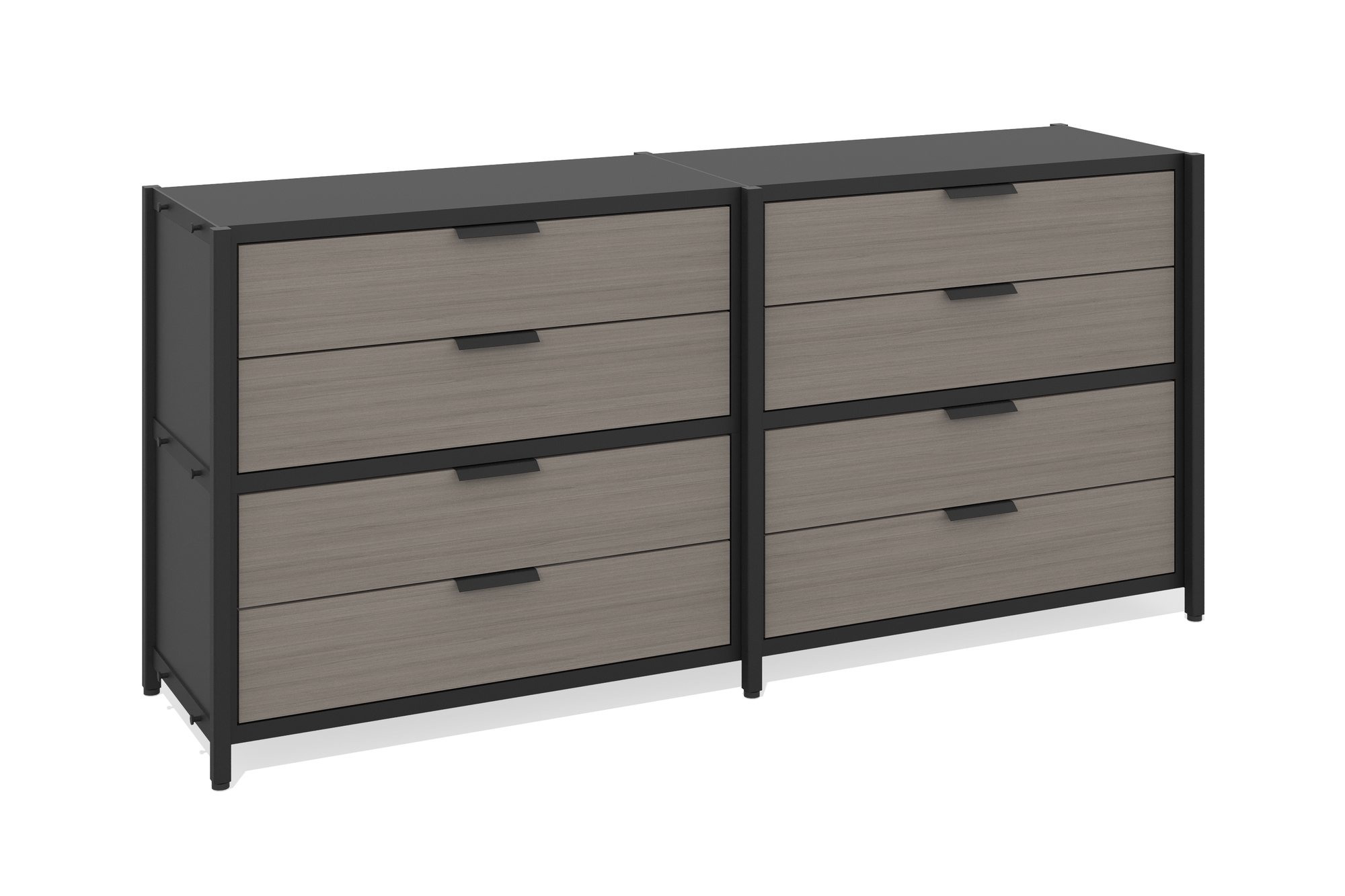 Стеллаж низкий 2 секции (Два уровня с ящиками, Фасад: файнлайн средне-серый, Корпус А: черный графит, черный муар)