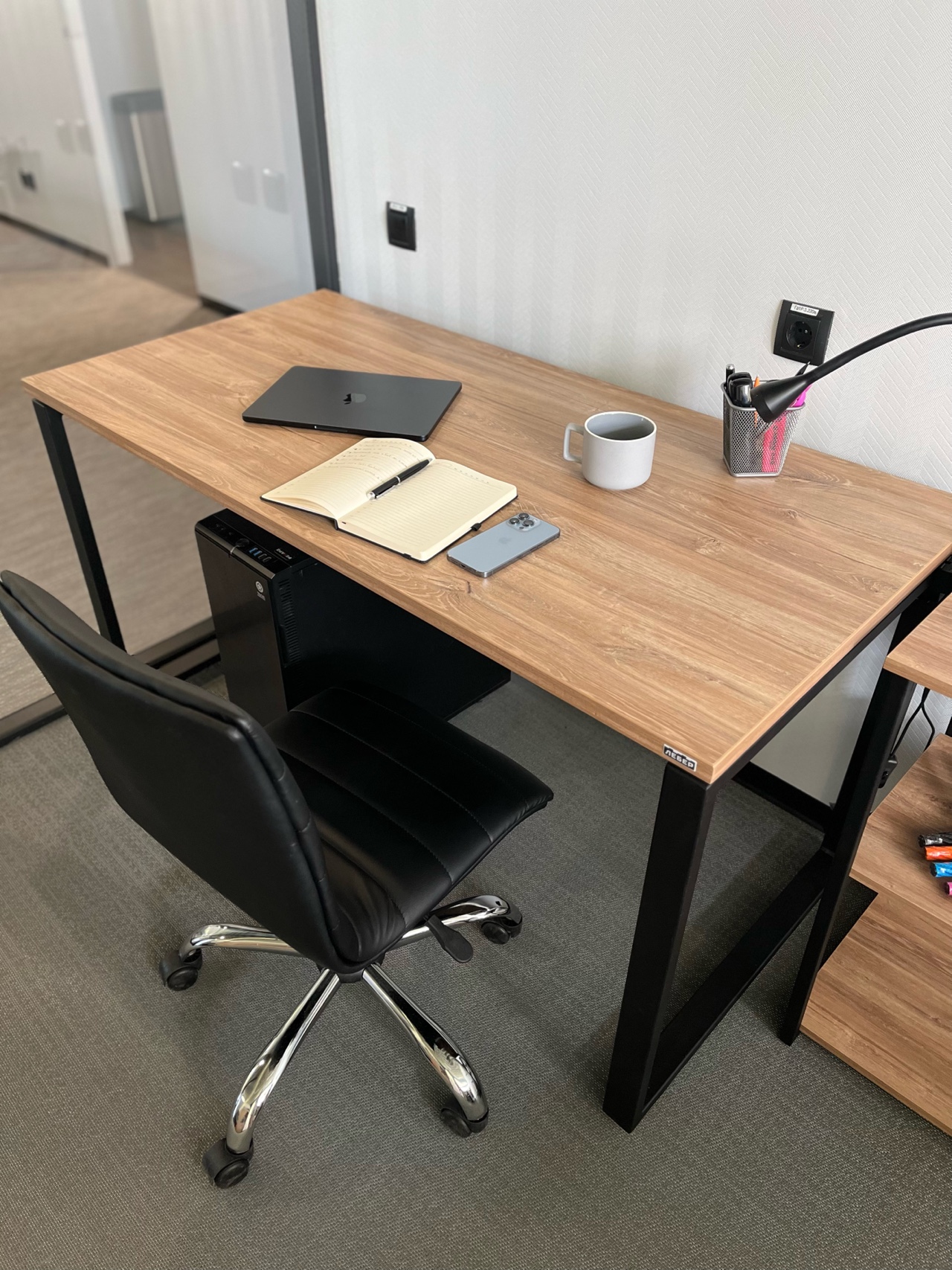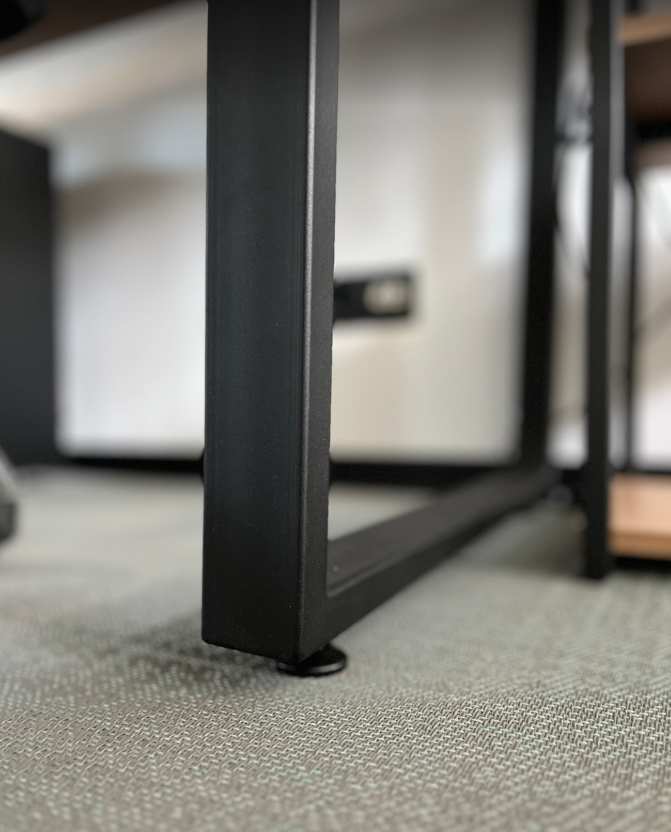 Удобный и функциональный рабочий стол. Благодаря креплениям для аксессуаров к столу можно добавить подвесную тумбу, кабель-канал, подвес для системного блока и экран для ног.