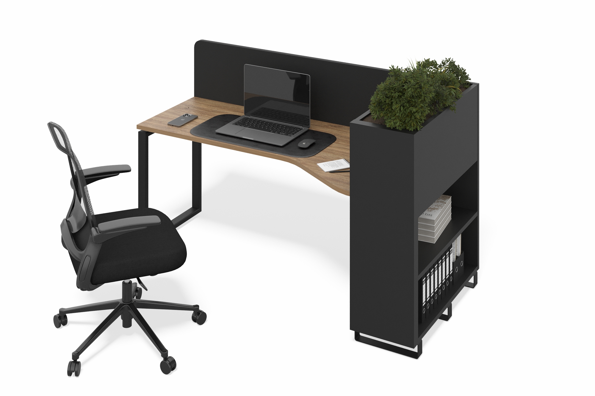 Стол офисный с кашпо (дуб канзас, Фасад: дуб канзас, Корпус А: черный графит, черный муар, Кашпо без ящиков, Левая)