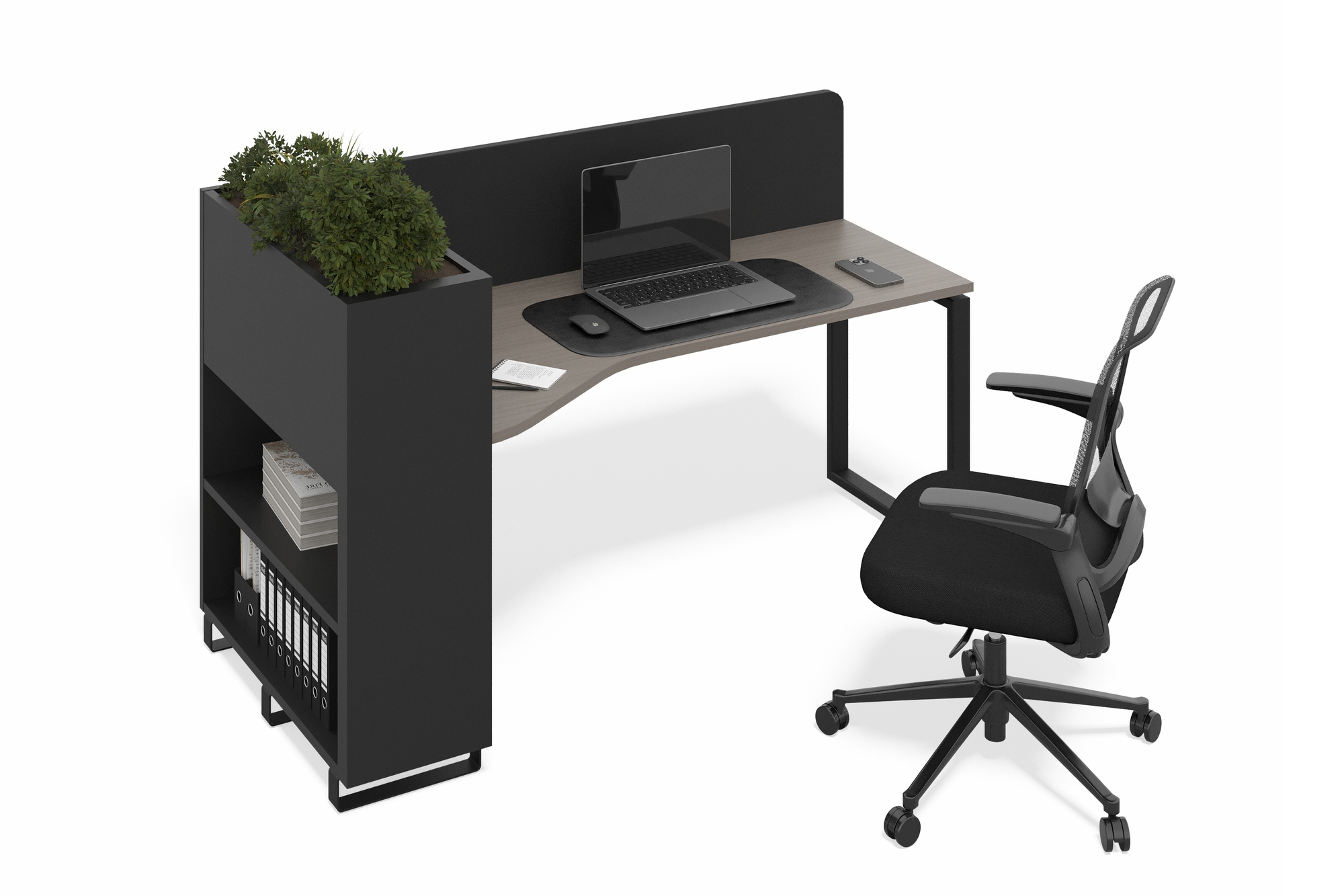 Стол офисный с кашпо (файнлайн средне-серый, Фасад: файнлайн средне-серый, черный муар, Кашпо без ящиков, Правая)