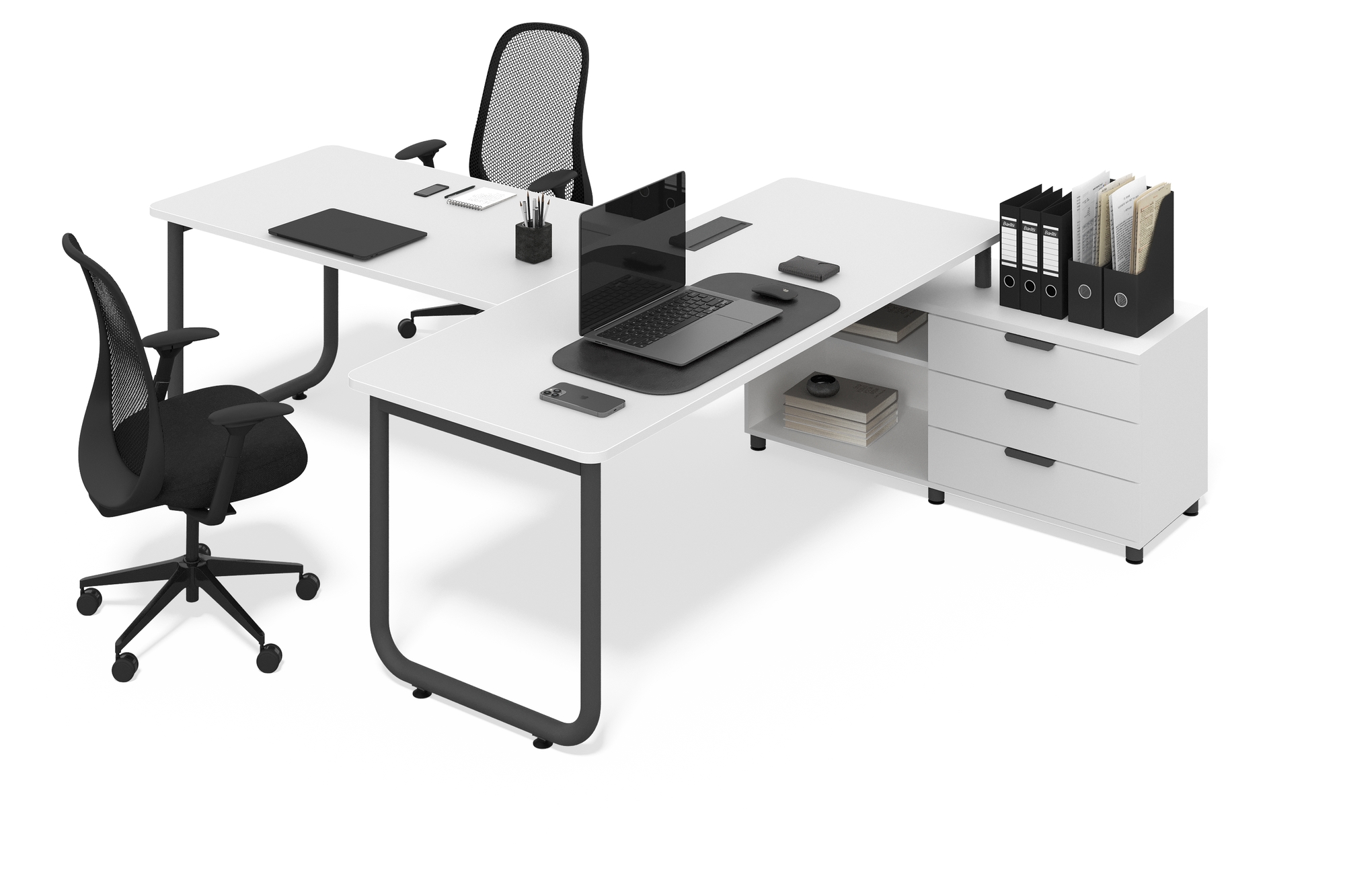 Создайте профессиональную атмосферу с рабочим столом, который подстраивается под ваш темп. Сочетание благородной текстуры дерева и матового черного металла подчеркивает современный индустриальный стиль. Благодаря угловой конструкции, у вас всегда будет под рукой всё необходимое — от ноутбука до важных архивов.