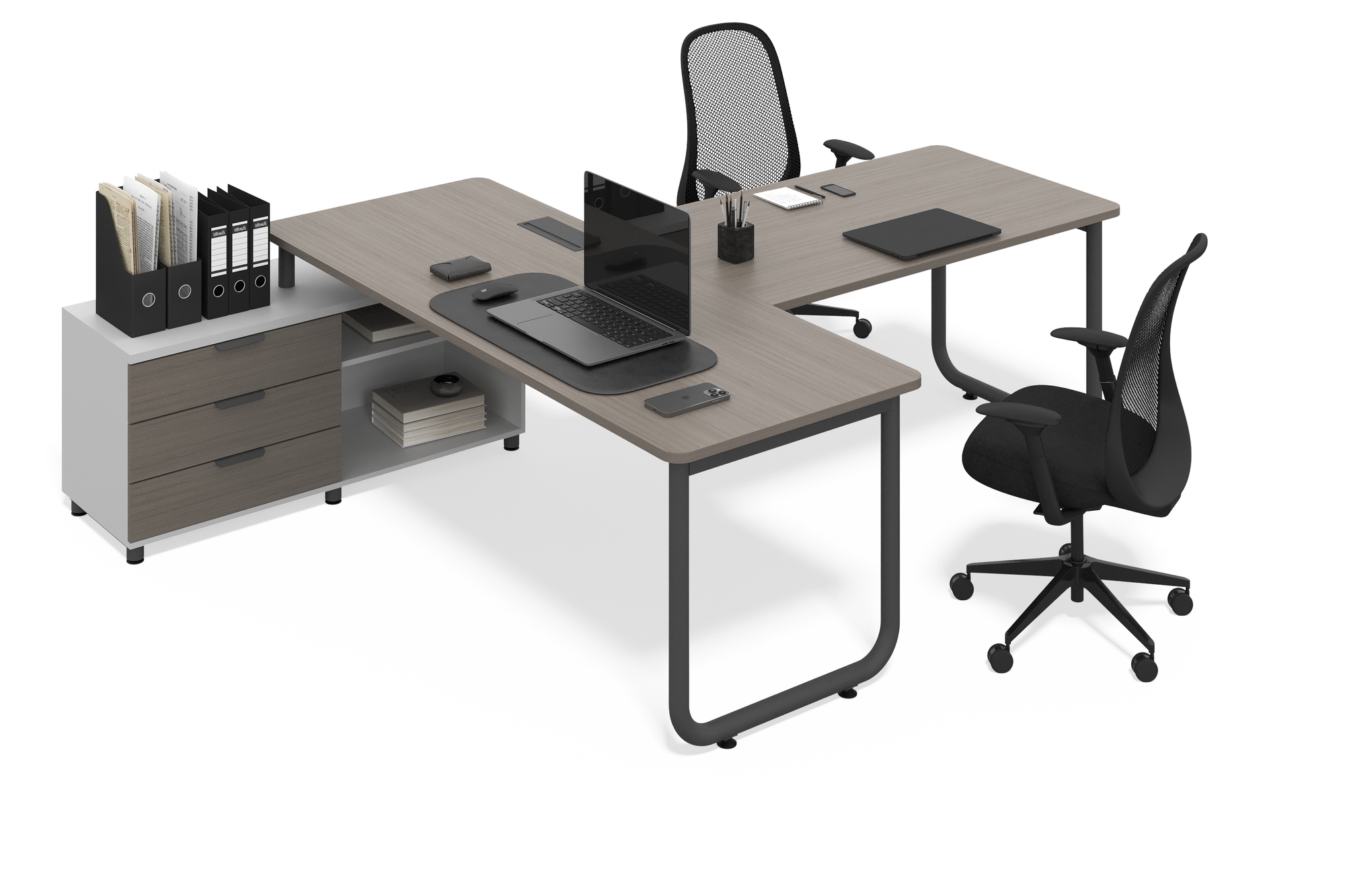 Создайте профессиональную атмосферу с рабочим столом, который подстраивается под ваш темп. Сочетание благородной текстуры дерева и матового черного металла подчеркивает современный индустриальный стиль. Благодаря угловой конструкции, у вас всегда будет под рукой всё необходимое — от ноутбука до важных архивов.