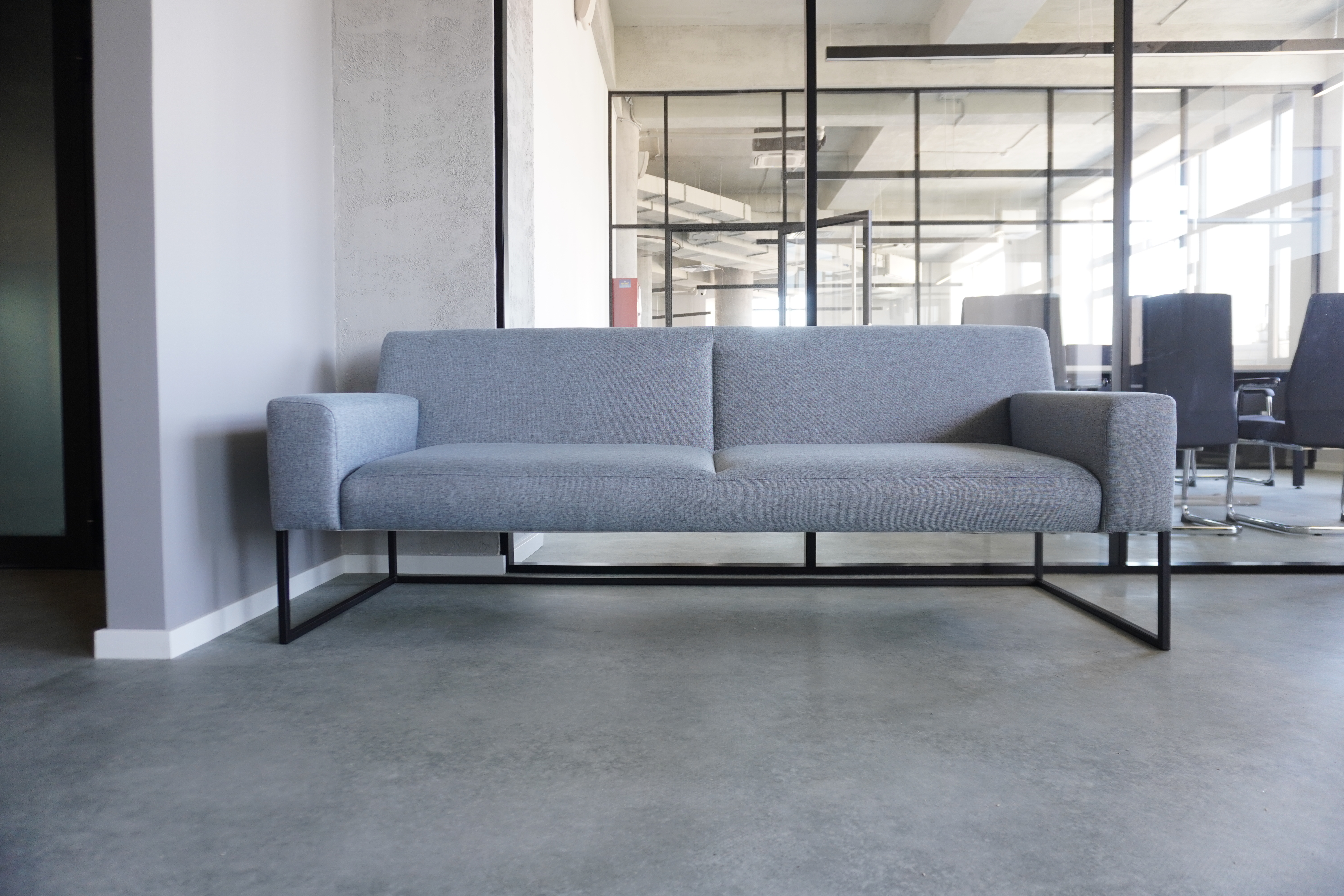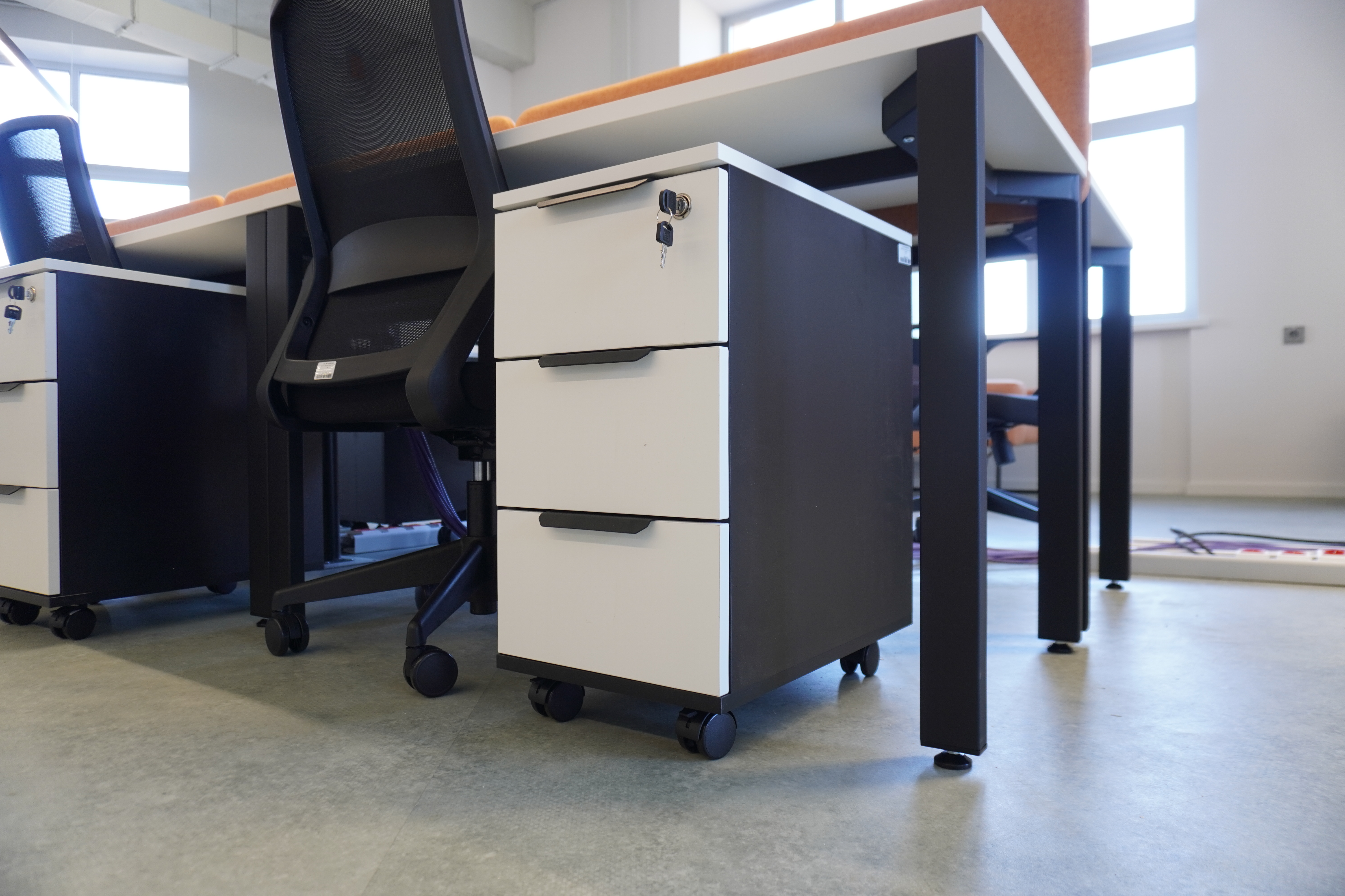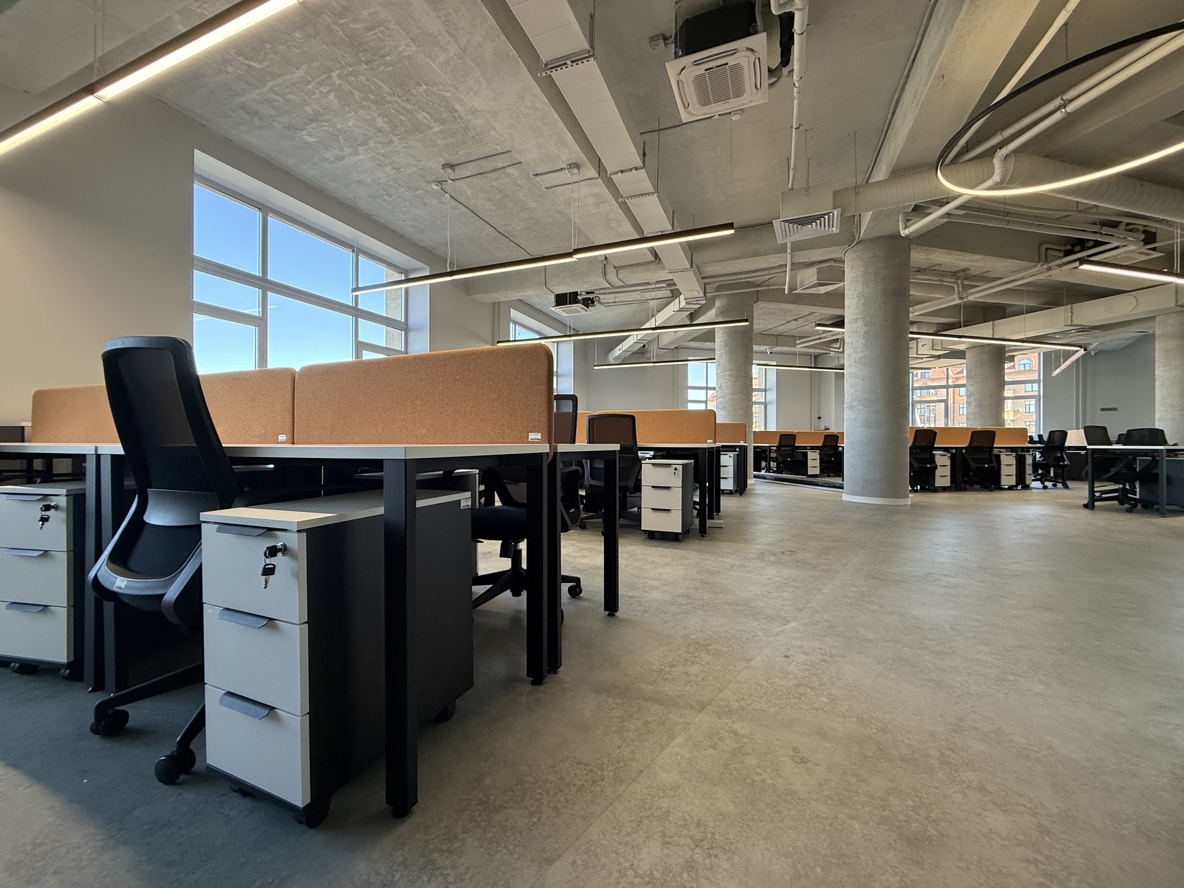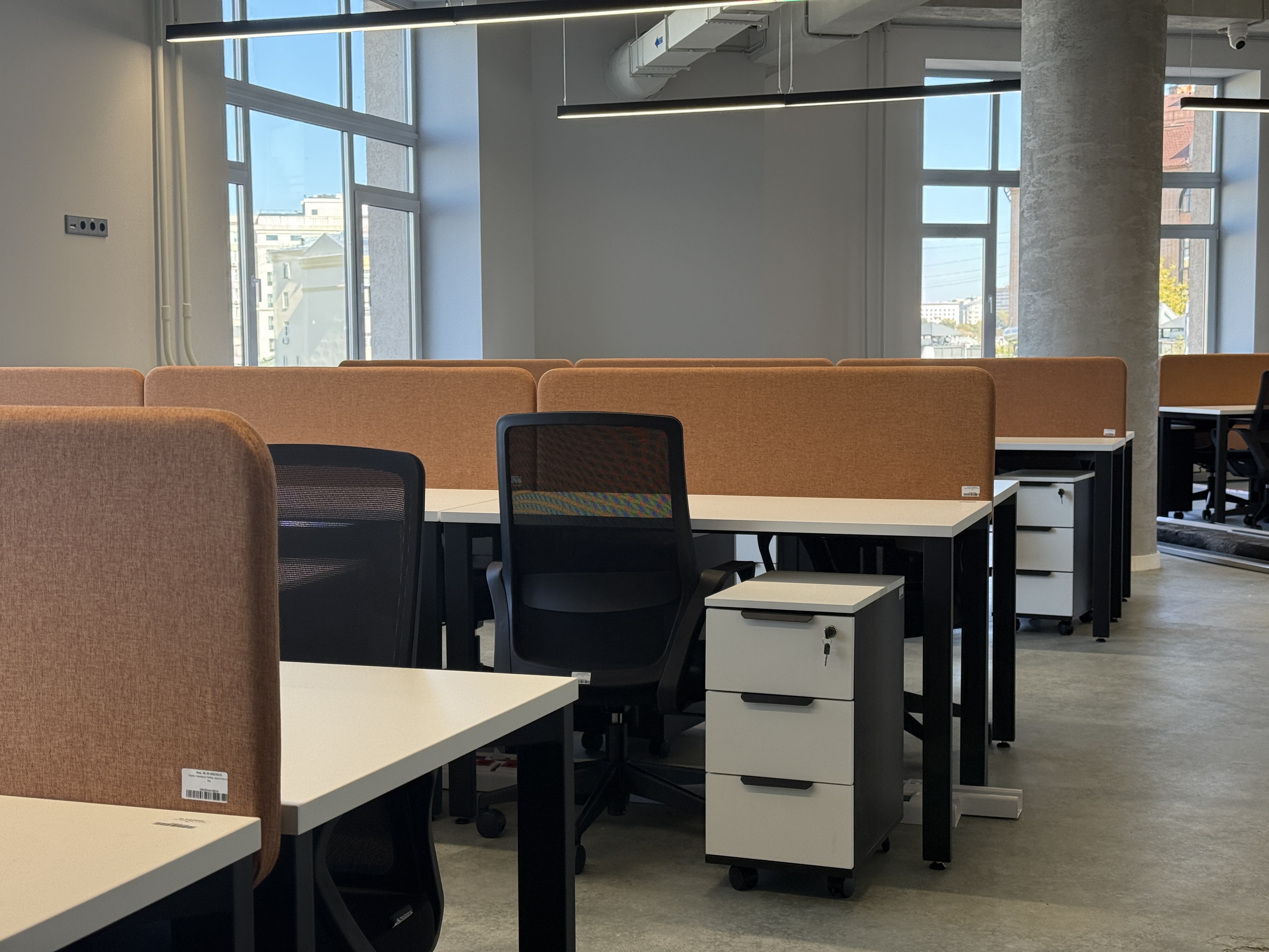 Что: бенч-системы для рабочих мест, ресепшен, прямой стол с опорой на тумбу, мобильная узкая тумба (кастомизированная по ширине), переговорный стол, шкаф-купе, стеллажная система.