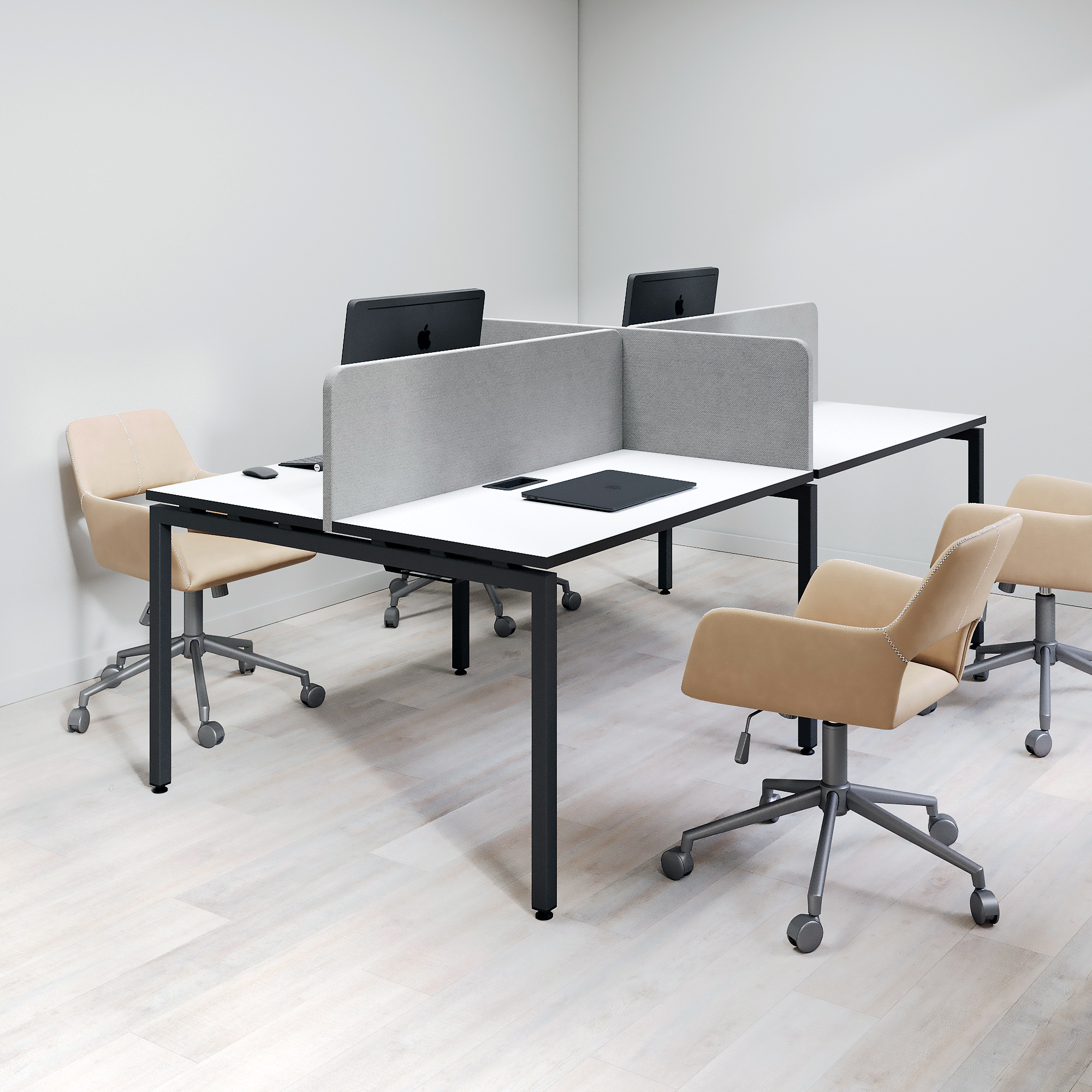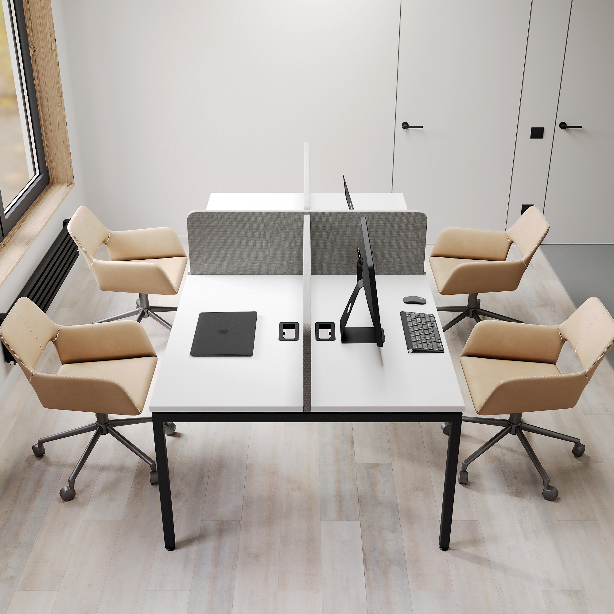 Бенч-система для офиса на 4 рабочих места. Металлический каркас обеспечивает необходимую прочность и долговечность. Благодаря особому порошковому покрытию металла, его поверхность не подвержена царапинам. Каждое рабочее место можно оснастить необходимым дополнительным оборудованием: кабель-каналами для проводов, ящиками для хранения документов, полками, лючками для проводов, а также различными аксессуарами: креплениями, зажимами, крючками для сумок, подкатными платформами для системного блока ПК.