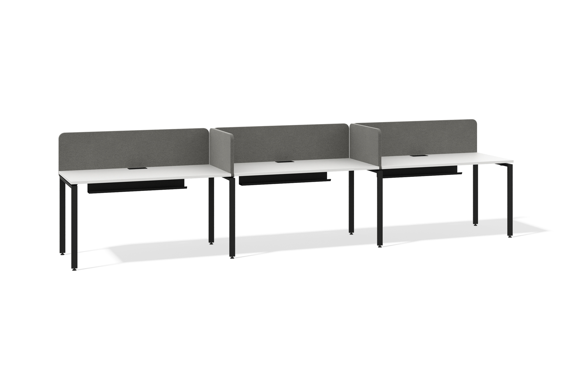 Бенч-система в один ряд — идеальный выбор для организации рабочих мест в офисах и коворкингах. Доступна в вариантах на 2, 3 или 4 рабочих места, что позволяет эффективно использовать пространство. Каркас из прочного металла с порошковым покрытием и регулируемыми подпятниками обеспечивает долговечность и стабильность на любых поверхностях. Столешница с парящим эффектом придаёт современный вид. Акустические перегородки (тканевые, войлочные или ЛДСП) улучшат звукоизоляцию, а встроенные лючок и кабель-канал обеспечат удобное размещение проводов.
