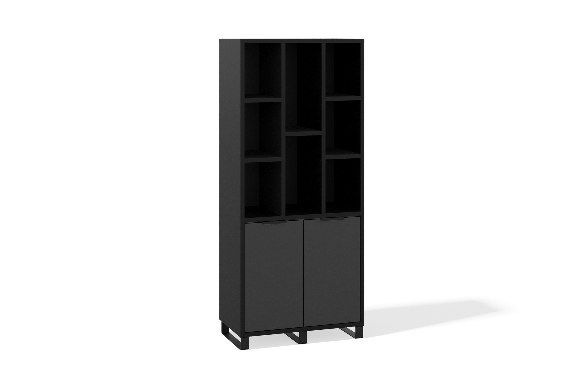 Функциональный шкаф с открытыми полками разной высоты подойдёт для хранения книг и декора. Нижний закрытый отсек с двумя распашными дверцами скрывает всё лишнее и помогает поддерживать порядок. Стильные металлические опоры придают конструкции лёгкость и современный дизайнерский облик.