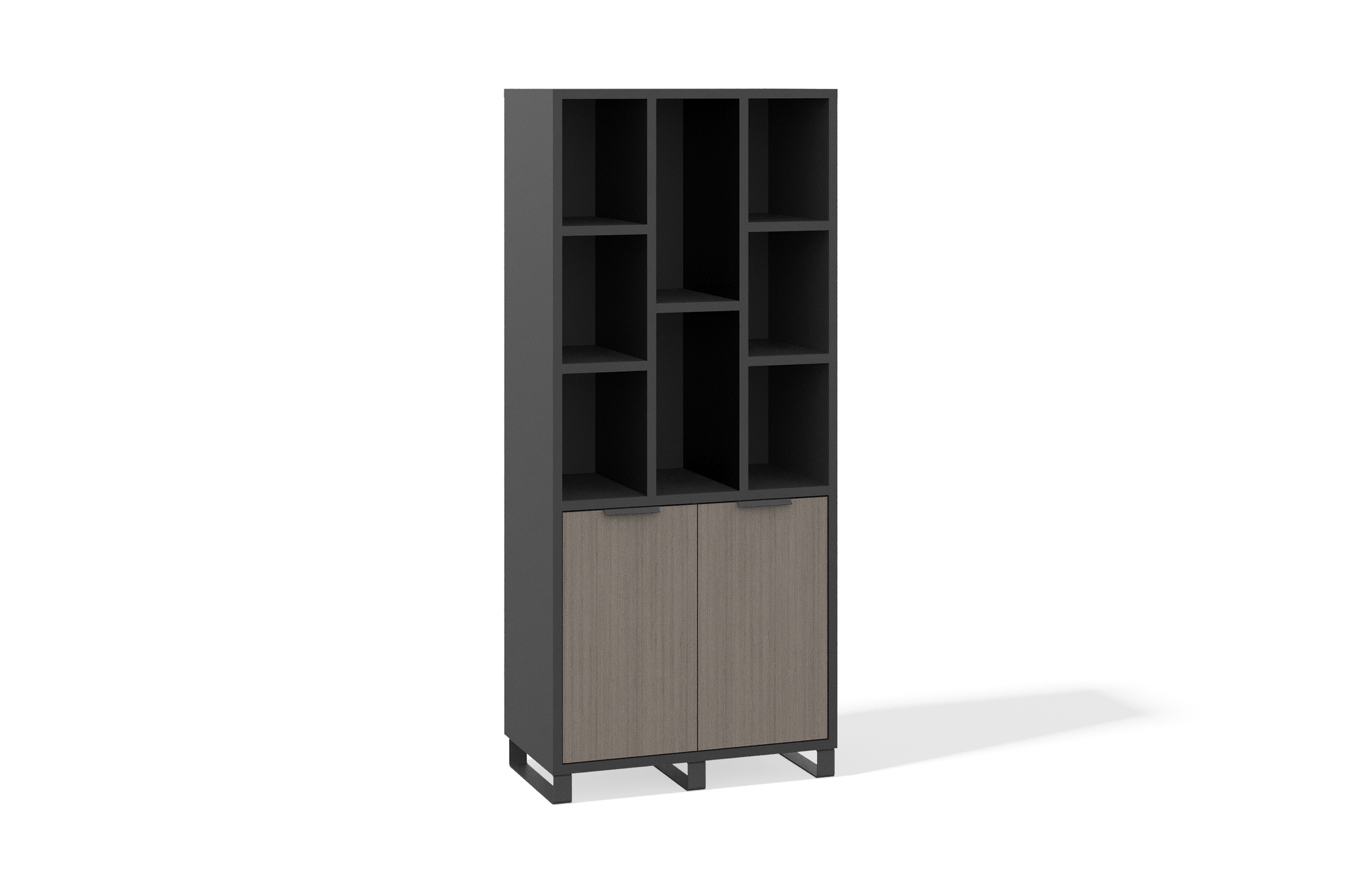 Функциональный шкаф с открытыми полками разной высоты подойдёт для хранения книг и декора. Нижний закрытый отсек с двумя распашными дверцами скрывает всё лишнее и помогает поддерживать порядок. Стильные металлические опоры придают конструкции лёгкость и современный дизайнерский облик.