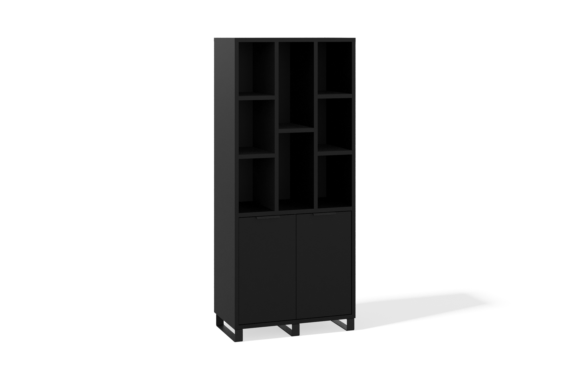 Функциональный шкаф с открытыми полками разной высоты подойдёт для хранения книг и декора. Нижний закрытый отсек с двумя распашными дверцами скрывает всё лишнее и помогает поддерживать порядок. Стильные металлические опоры придают конструкции лёгкость и современный дизайнерский облик.