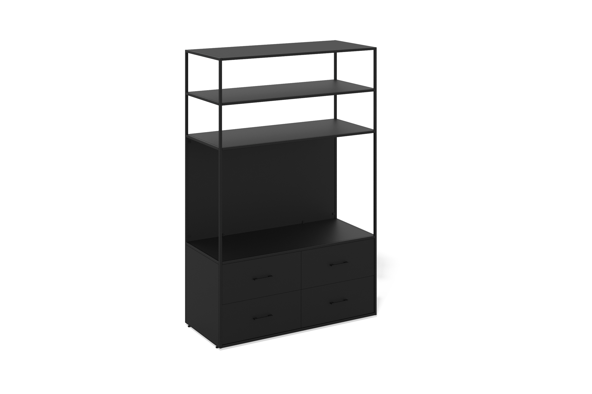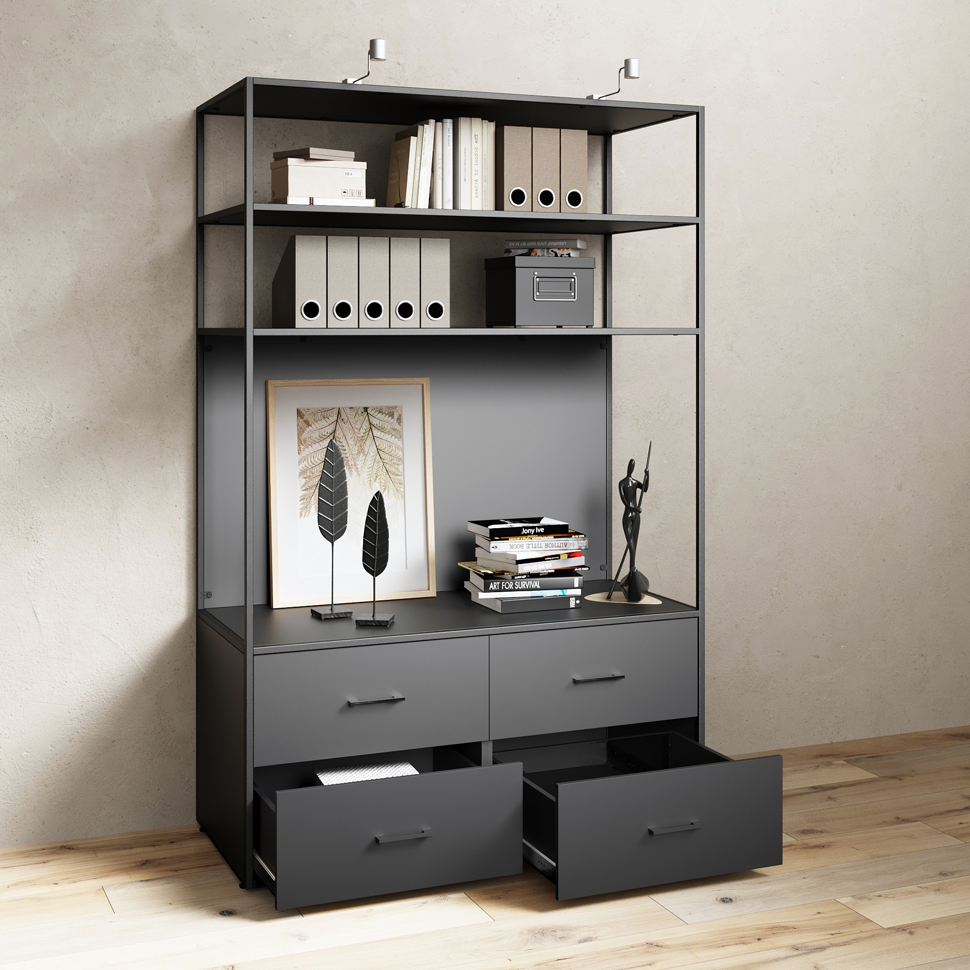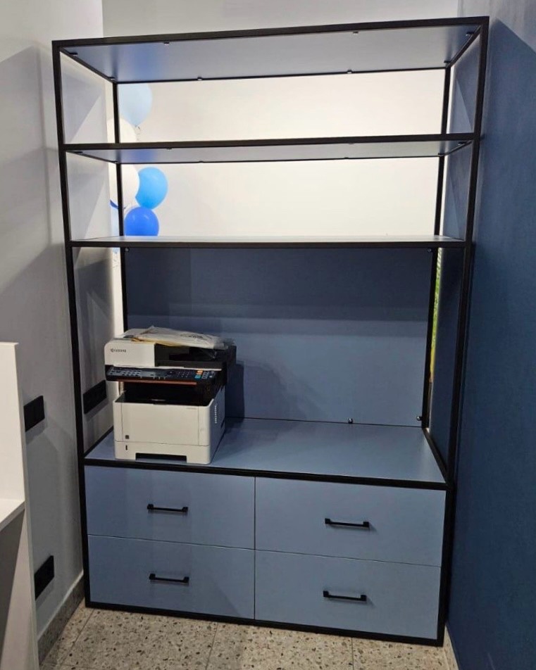 Шкаф-органайзер — функциональное решение для организации рабочего пространства. Удачное сочетание открытых полок и вместительных выдвижных ящиков.