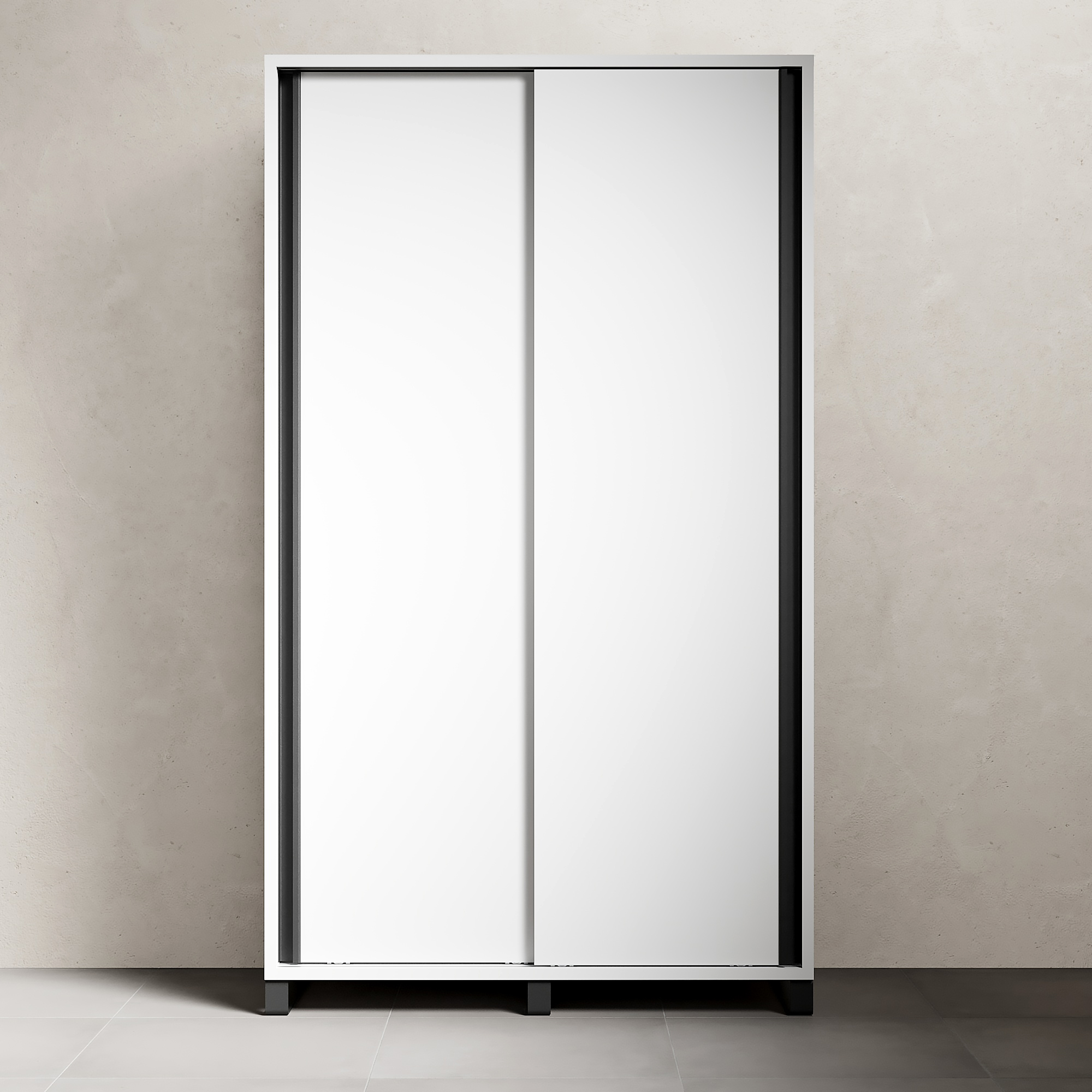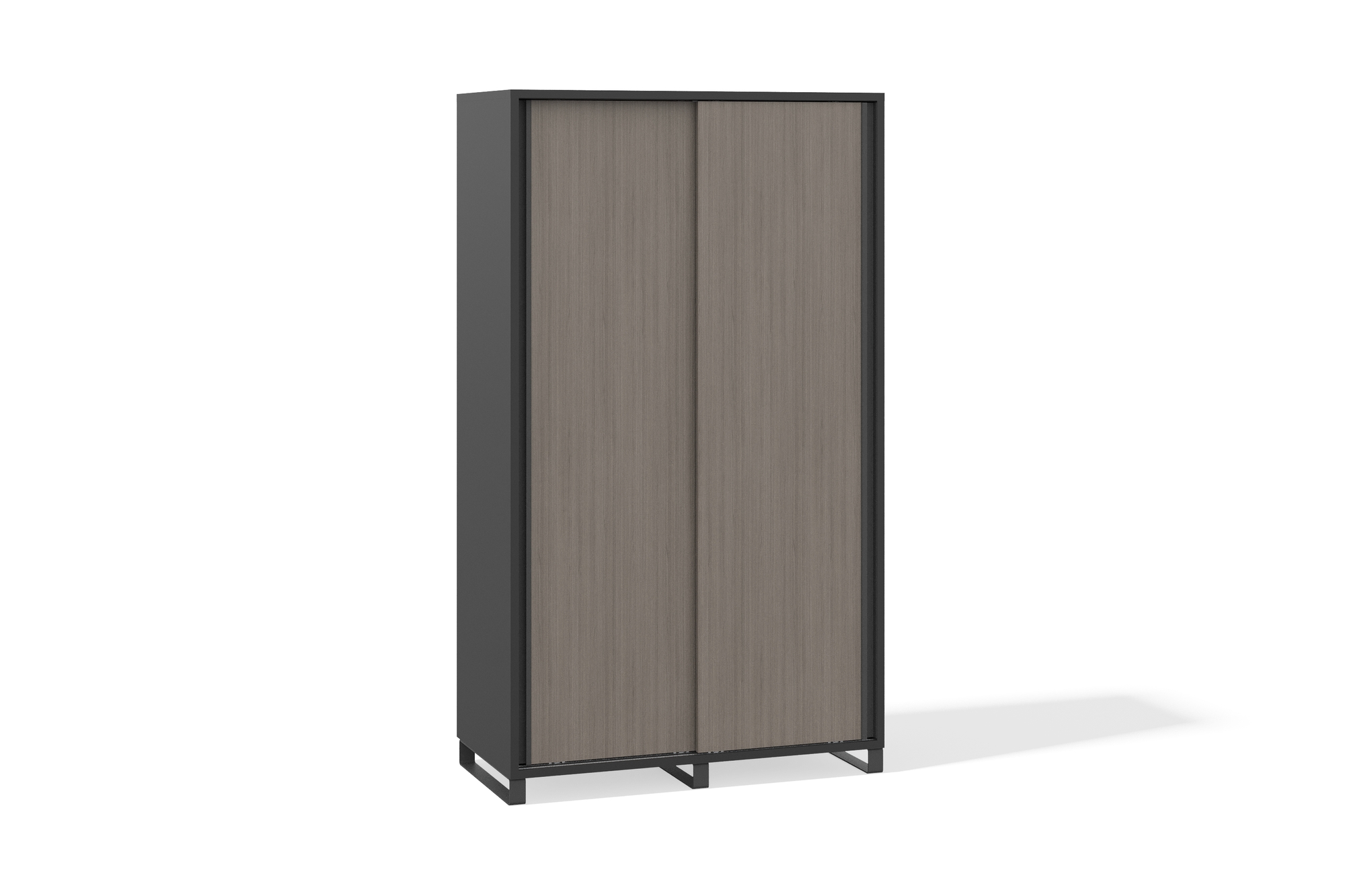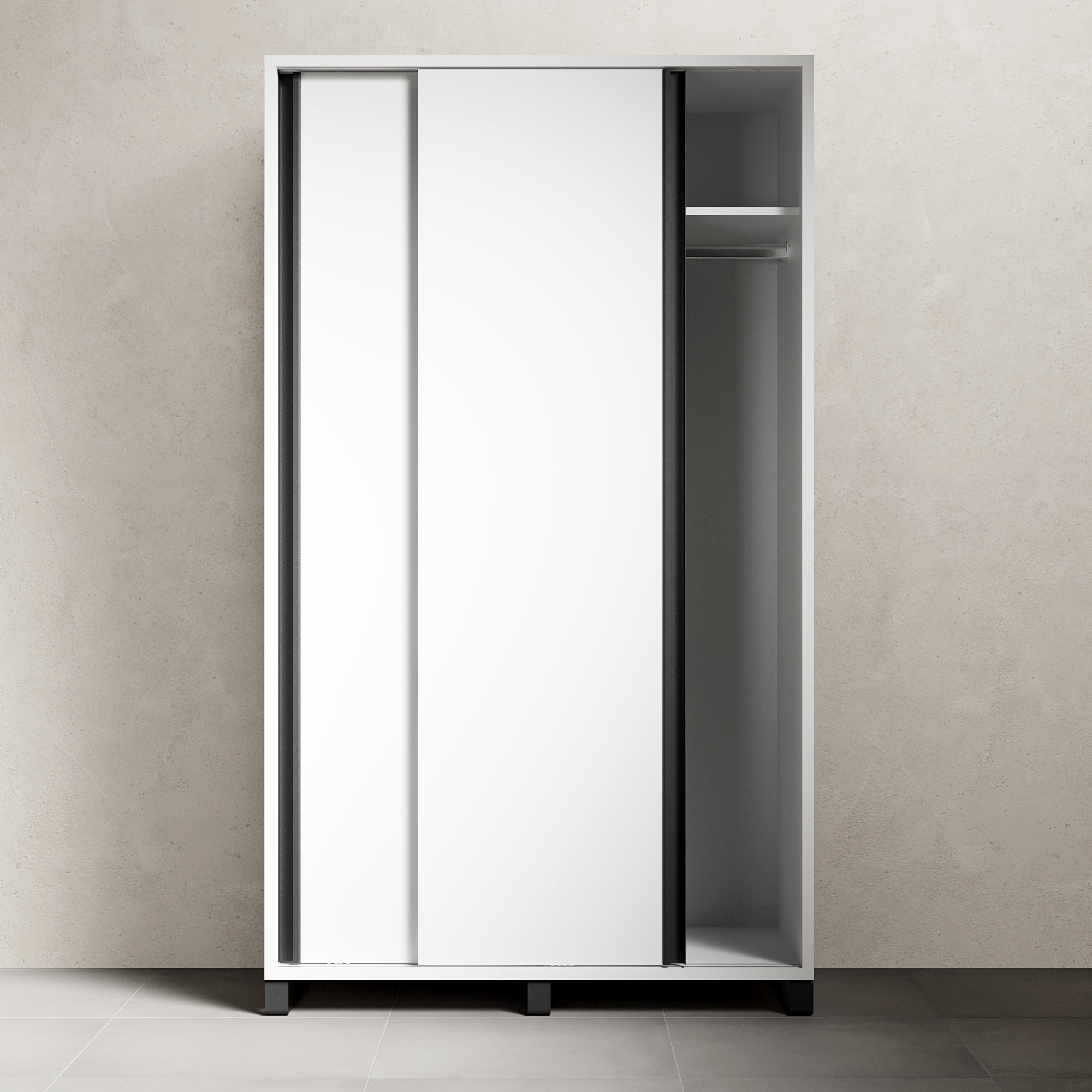 Вместительный высокий шкаф для одежды с раздвижными дверцами. Продуманное внутреннее пространство включает секции для хранения одежды на вешалках и полки для сложенных вещей. Раздвижная система дверей сэкономит место, а строгий, лаконичный дизайн гармонично впишется в современный интерьер.