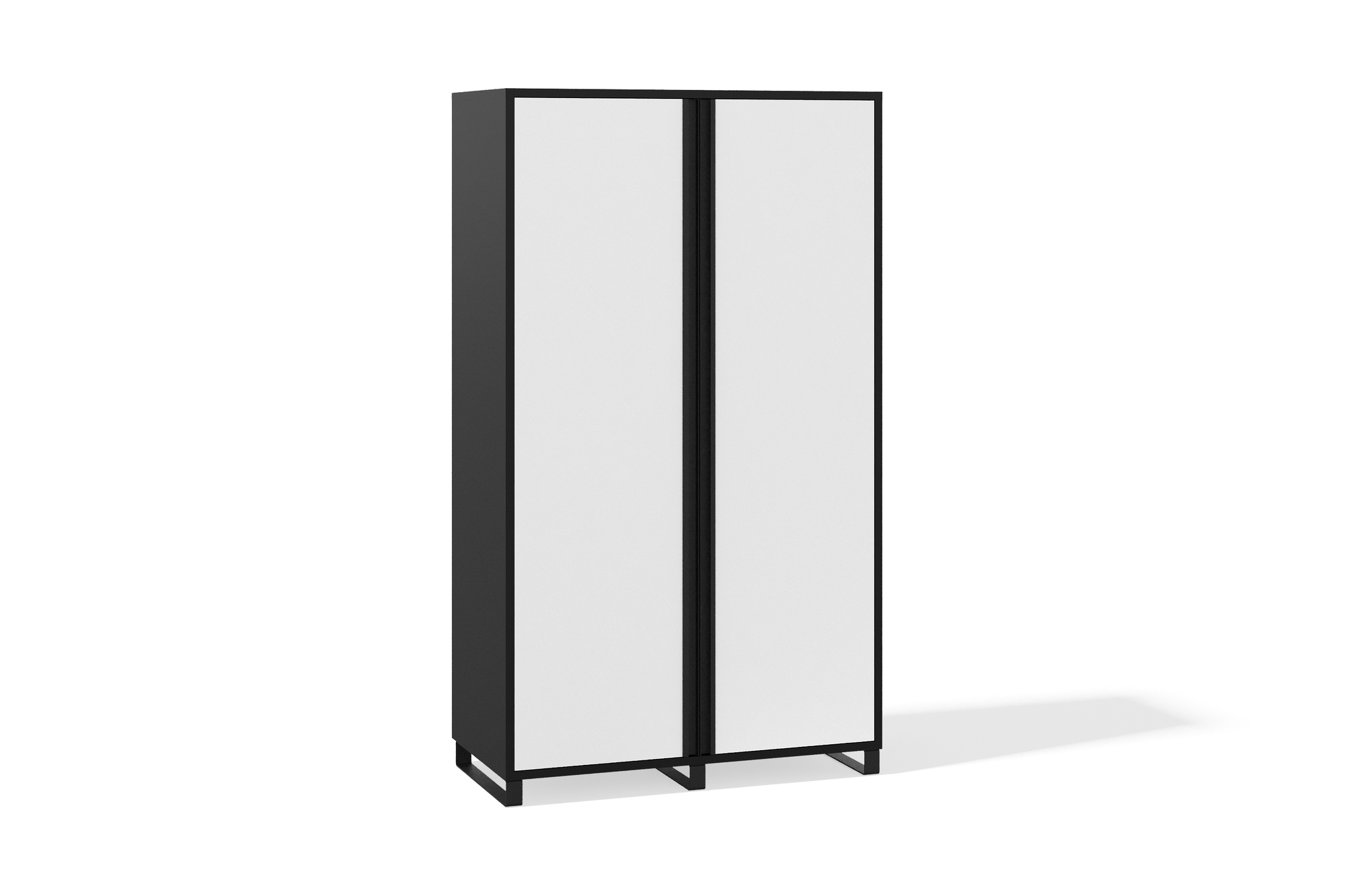 Вместительный шкаф для одежды с распашными дверцами подойдёт для хранения даже самого большого гардероба. Внутри расположены две прочные металлические трубы для вешалок, что позволяет удобно разместить одежду на плечиках. Стильные металлические опоры придают шкафу визуальную лёгкость, дополняя его лаконичный дизайн.