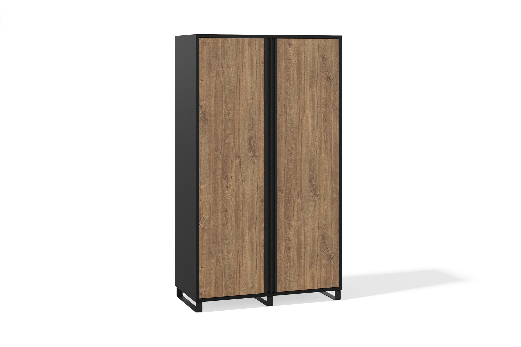 Вместительный шкаф для одежды с распашными дверцами подойдёт для хранения даже самого большого гардероба. Внутри расположены две прочные металлические трубы для вешалок, что позволяет удобно разместить одежду на плечиках. Стильные металлические опоры придают шкафу визуальную лёгкость, дополняя его лаконичный дизайн.