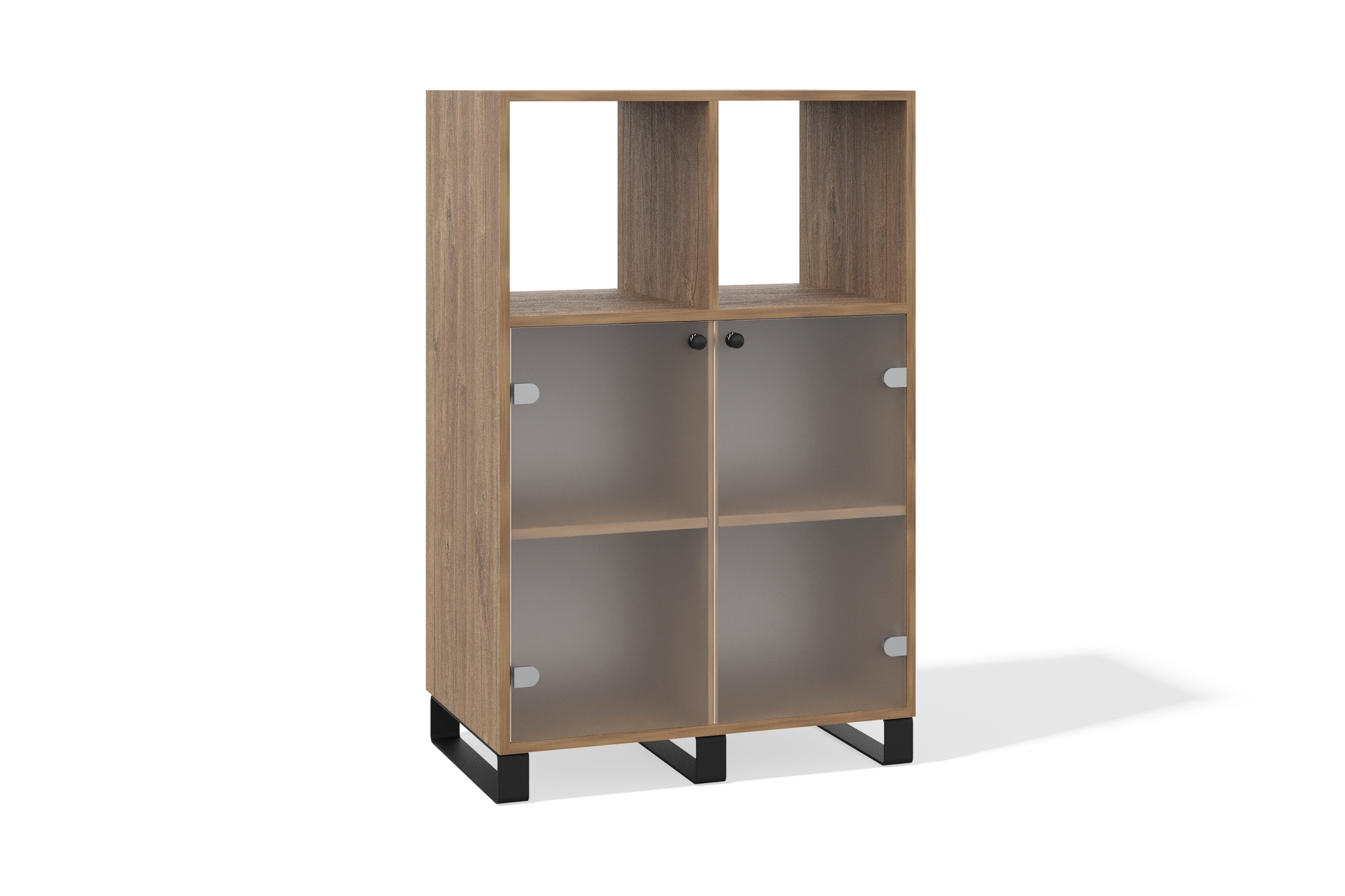 Стильный стеллаж с открытым верхним блоком и закрытыми фасадами из матового стекла — практичное решение для хранения и организации пространства. Металлические опоры обеспечивают прочность и устойчивость, а регулируемые полки позволяют легко адаптировать внутреннее пространство стеллажа под ваши нужды.