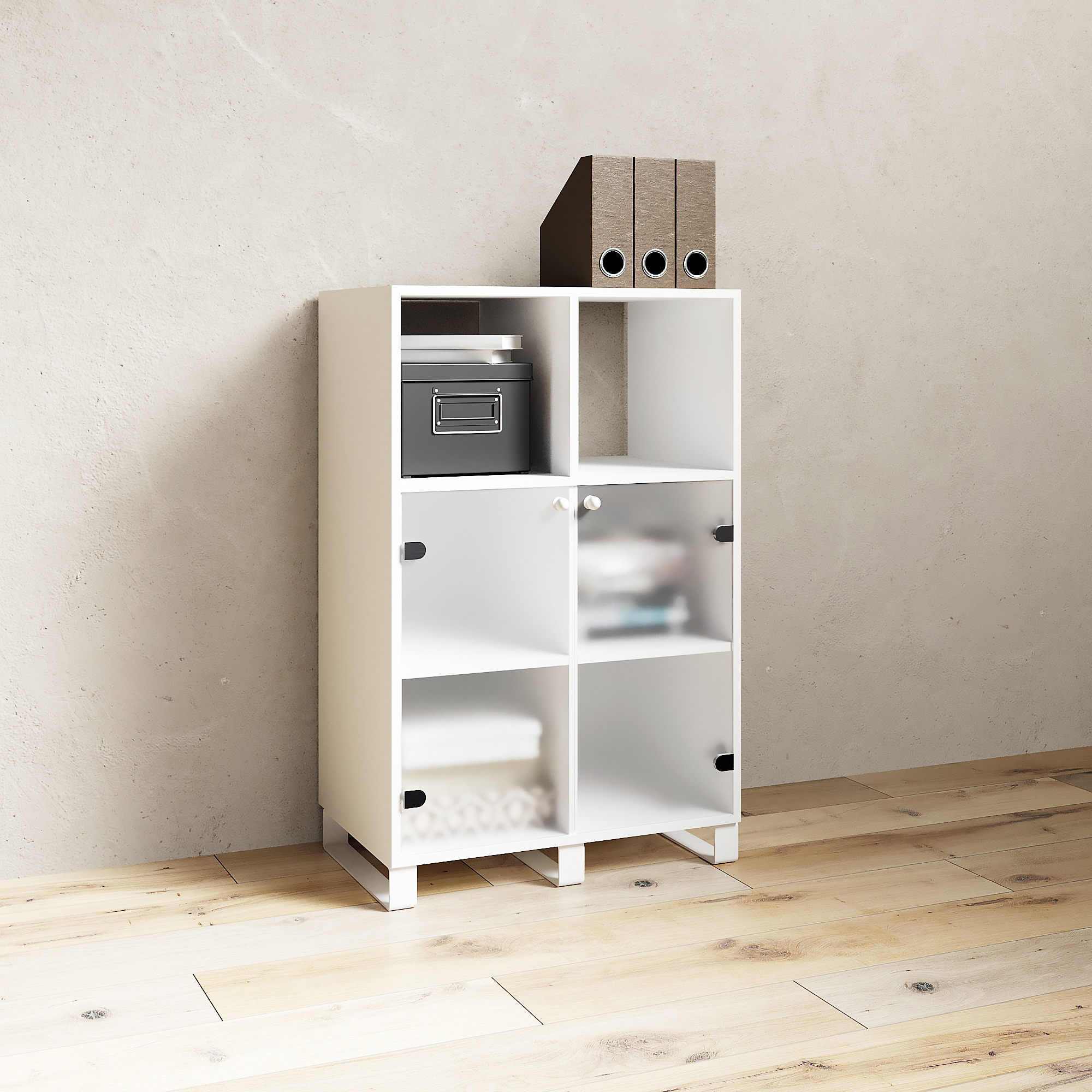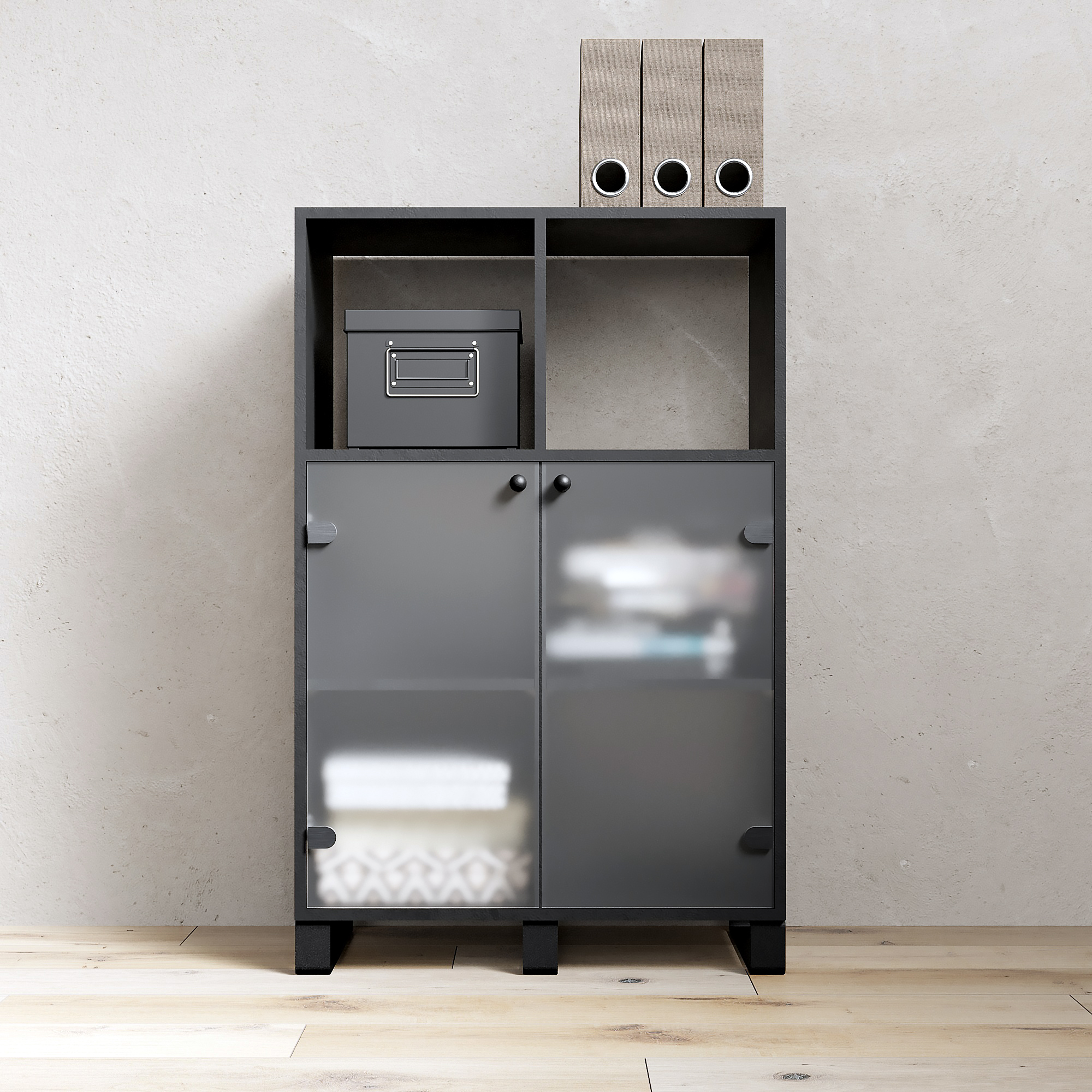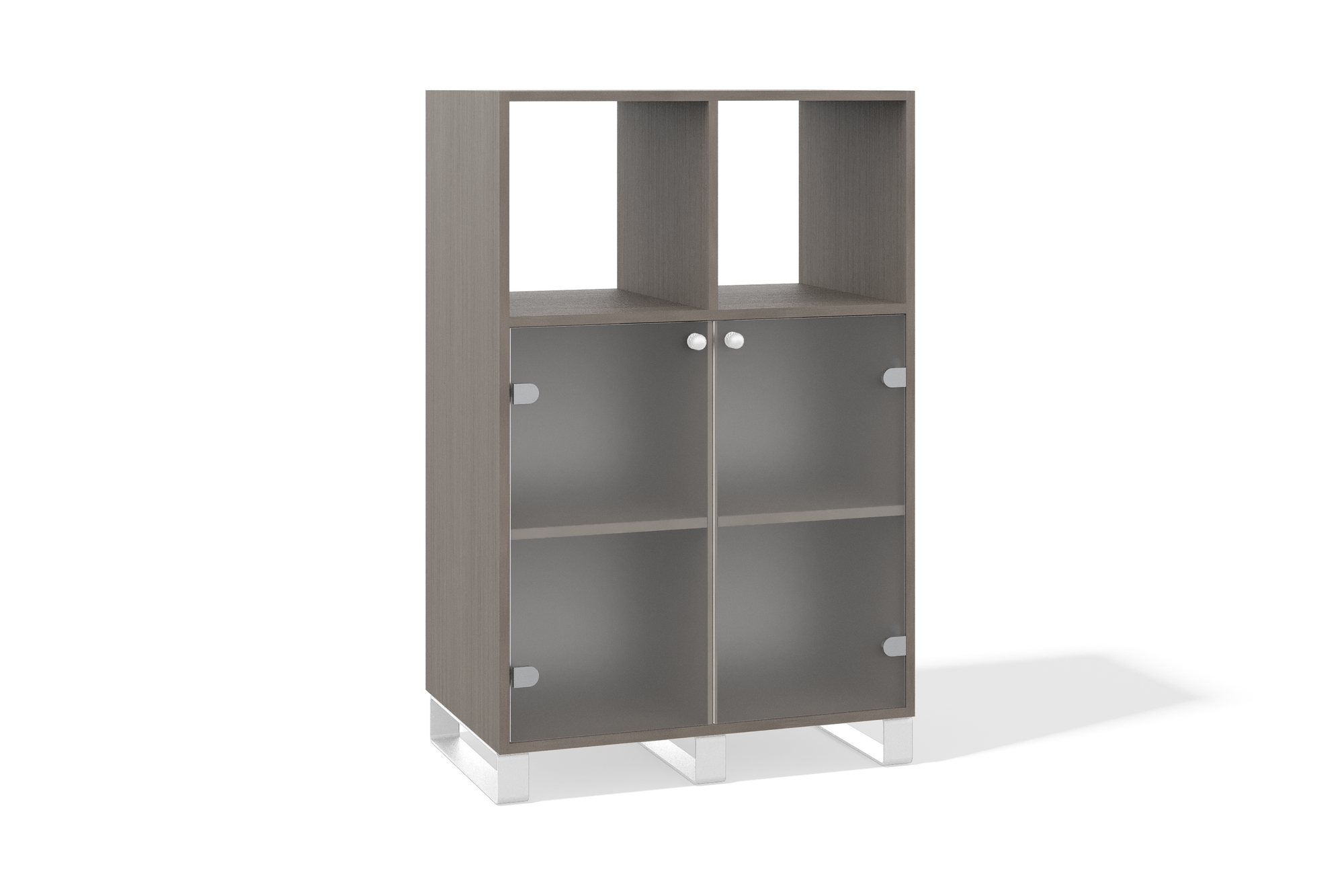 Стильный стеллаж с открытым верхним блоком и закрытыми фасадами из матового стекла — практичное решение для хранения и организации пространства. Металлические опоры обеспечивают прочность и устойчивость, а регулируемые полки позволяют легко адаптировать внутреннее пространство стеллажа под ваши нужды.