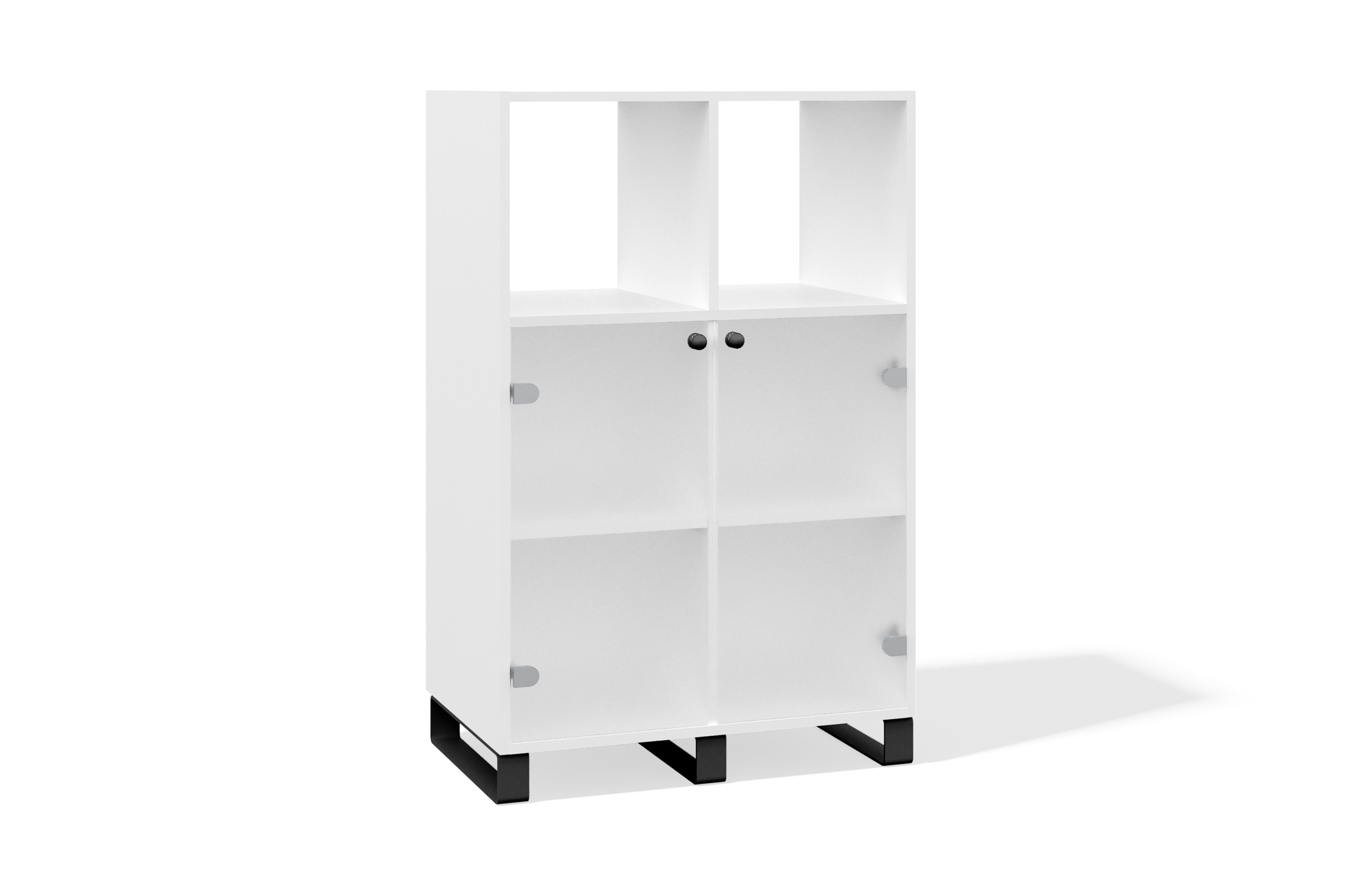 Стильный стеллаж с открытым верхним блоком и закрытыми фасадами из матового стекла — практичное решение для хранения и организации пространства. Металлические опоры обеспечивают прочность и устойчивость, а регулируемые полки позволяют легко адаптировать внутреннее пространство стеллажа под ваши нужды.