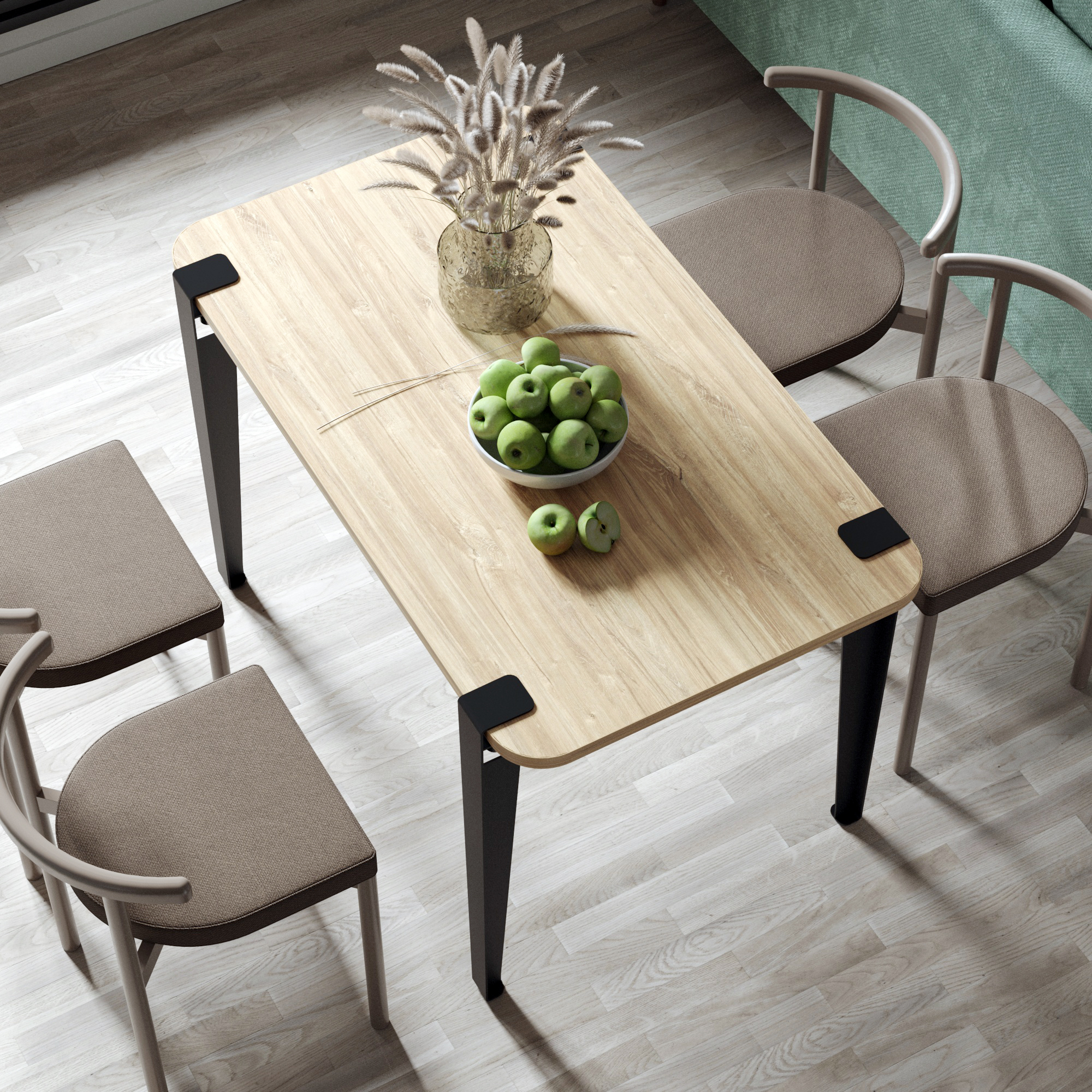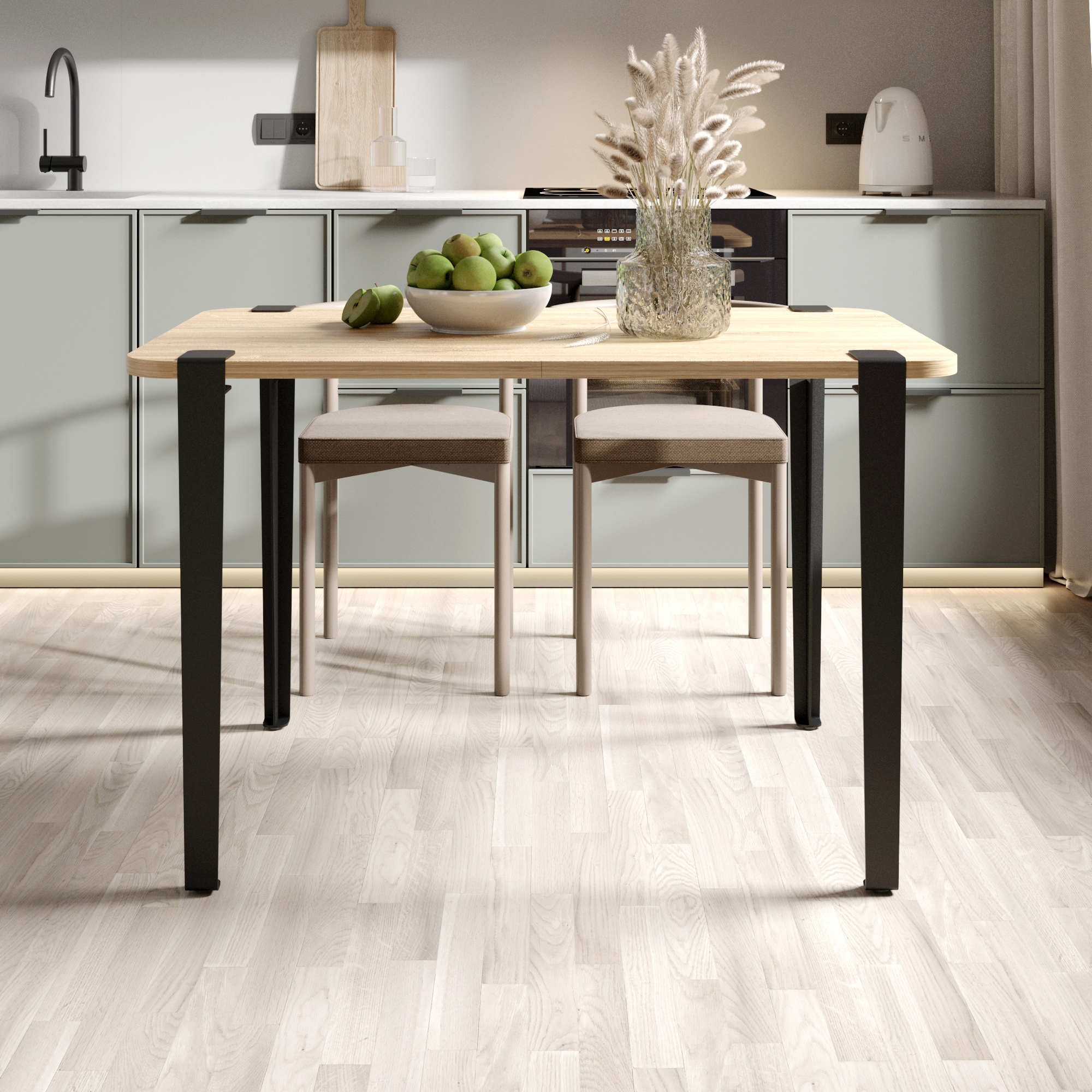 Стол для дома с лаконичным дизайном и практичными деталями. Столешница устойчива к царапинам и проста в уходе. Закругленные края придают столу мягкий, безопасный силуэт — идеально для дома с детьми. Съемные стальные опоры обеспечивают надежную устойчивость и позволяют легко транспортировать или хранить стол при необходимости, а также придают изделию дизайнерский вид.
