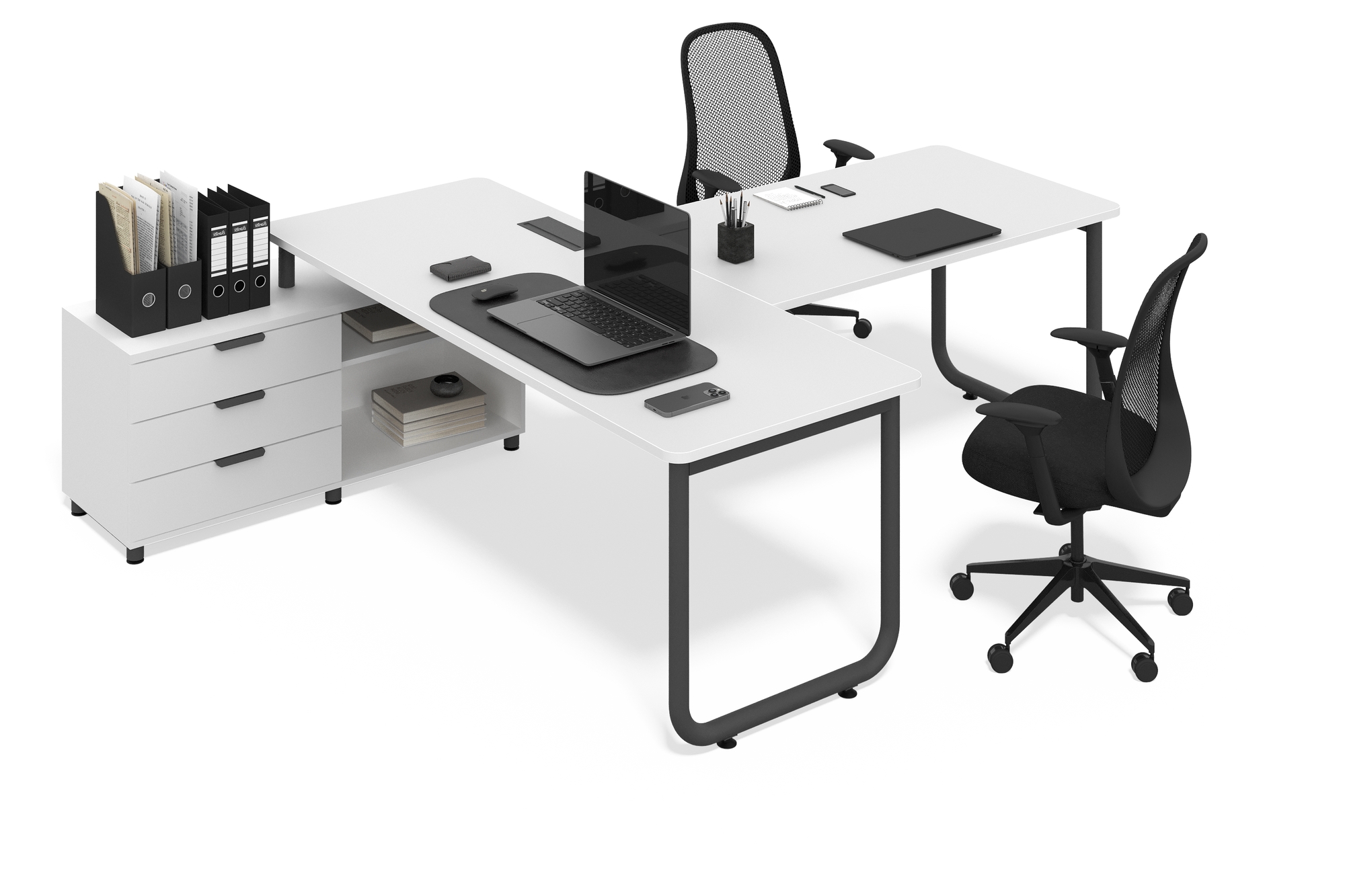 Создайте профессиональную атмосферу с рабочим столом, который подстраивается под ваш темп. Сочетание благородной текстуры дерева и матового черного металла подчеркивает современный индустриальный стиль. Благодаря угловой конструкции, у вас всегда будет под рукой всё необходимое — от ноутбука до важных архивов.