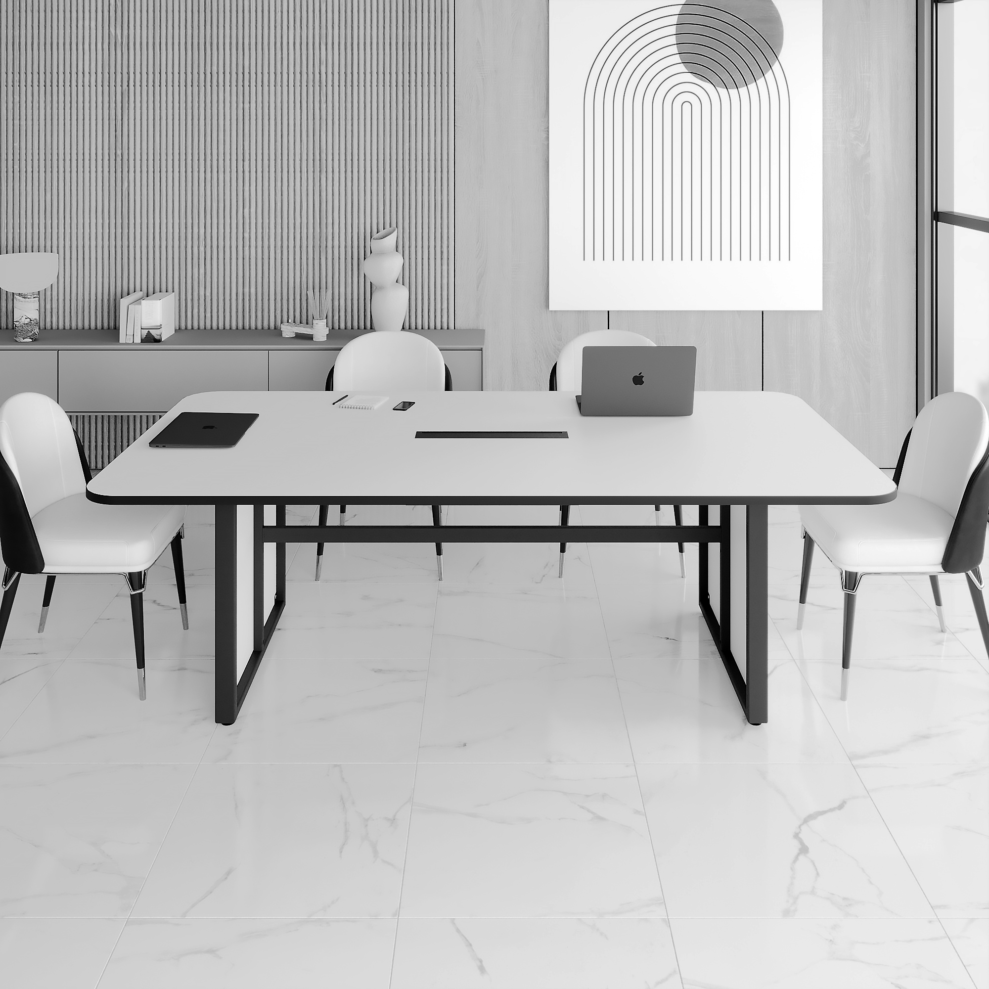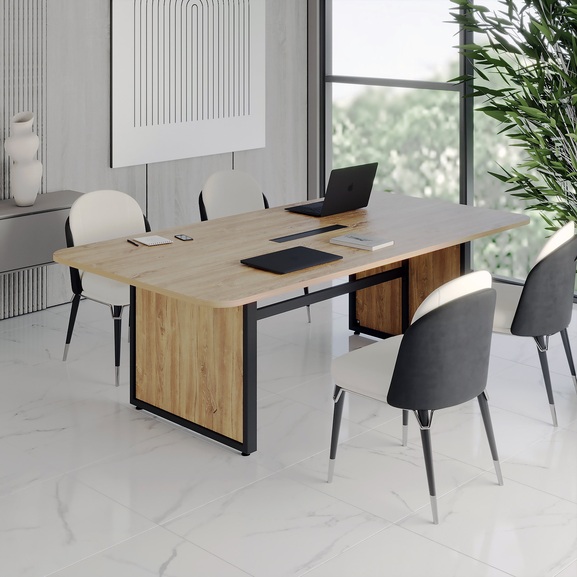 Переговорный офисный стол оснащен продуманной системой организации проводов: центральный лючок в столешнице и встроенная корзина позволяют аккуратно разместить кабели и адаптеры, сохраняя пространство эстетичным. Широкая поверхность обеспечивает комфорт для участников, а эргономичный дизайн поддерживает продуктивность как в офлайн-встречах, так и во время видеоконференций.