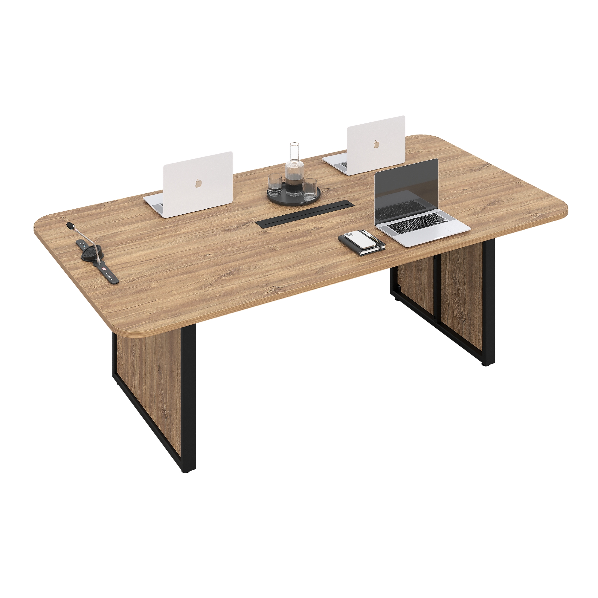 Переговорный офисный стол оснащен продуманной системой организации проводов: центральный лючок в столешнице и встроенная корзина позволяют аккуратно разместить кабели и адаптеры, сохраняя пространство эстетичным. Широкая поверхность обеспечивает комфорт для участников, а эргономичный дизайн поддерживает продуктивность как в офлайн-встречах, так и во время видеоконференций.