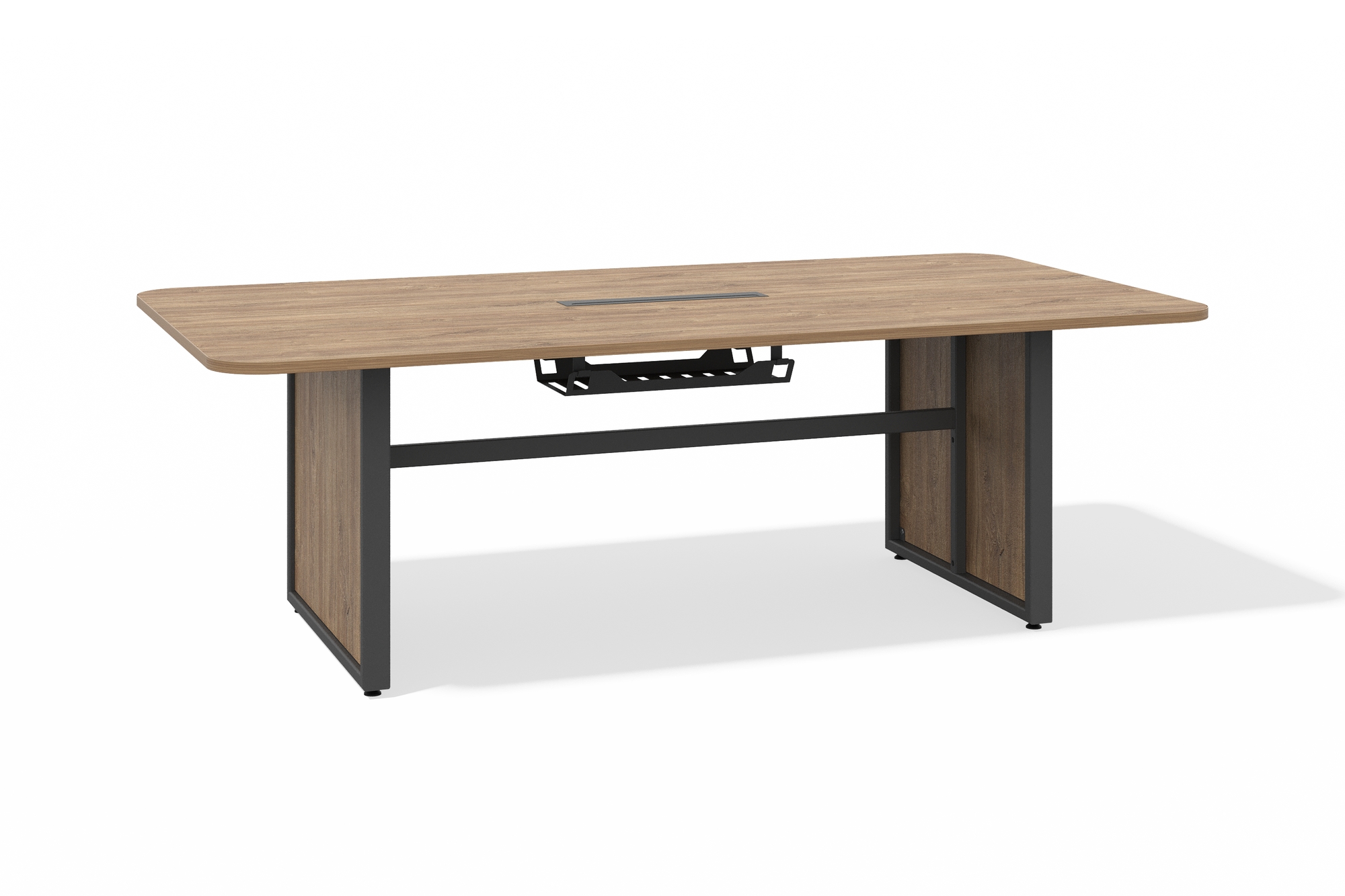 Переговорный офисный стол оснащен продуманной системой организации проводов: центральный лючок в столешнице и встроенная корзина позволяют аккуратно разместить кабели и адаптеры, сохраняя пространство эстетичным. Широкая поверхность обеспечивает комфорт для участников, а эргономичный дизайн поддерживает продуктивность как в офлайн-встречах, так и во время видеоконференций.