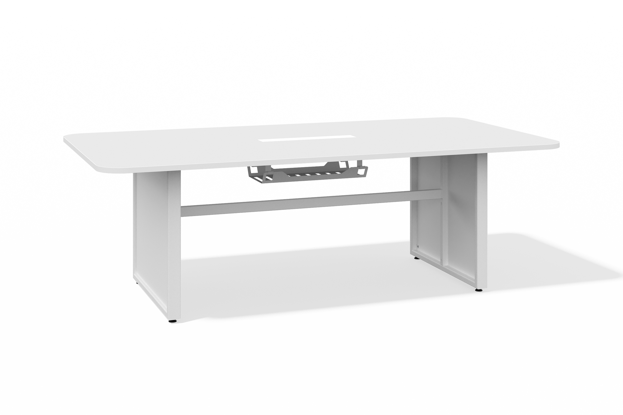 Переговорный офисный стол оснащен продуманной системой организации проводов: центральный лючок в столешнице и встроенная корзина позволяют аккуратно разместить кабели и адаптеры, сохраняя пространство эстетичным. Широкая поверхность обеспечивает комфорт для участников, а эргономичный дизайн поддерживает продуктивность как в офлайн-встречах, так и во время видеоконференций.