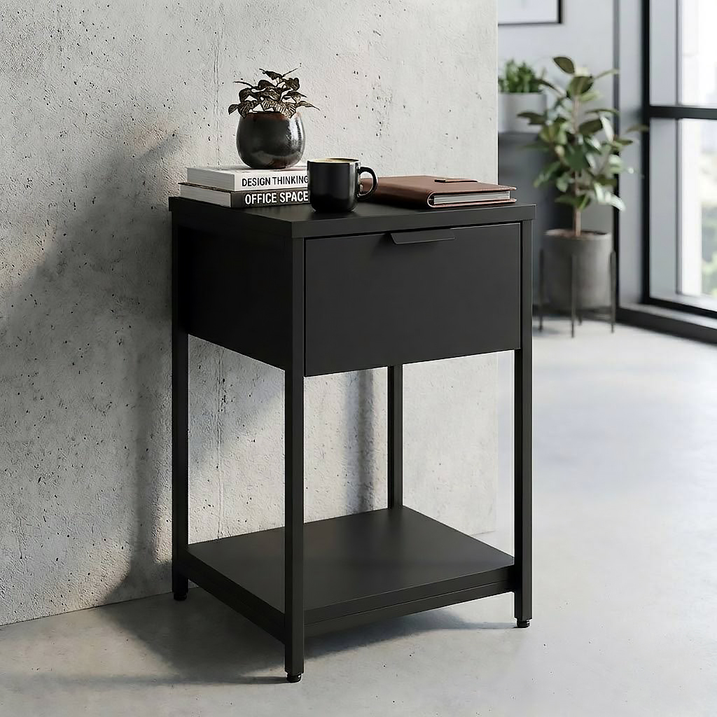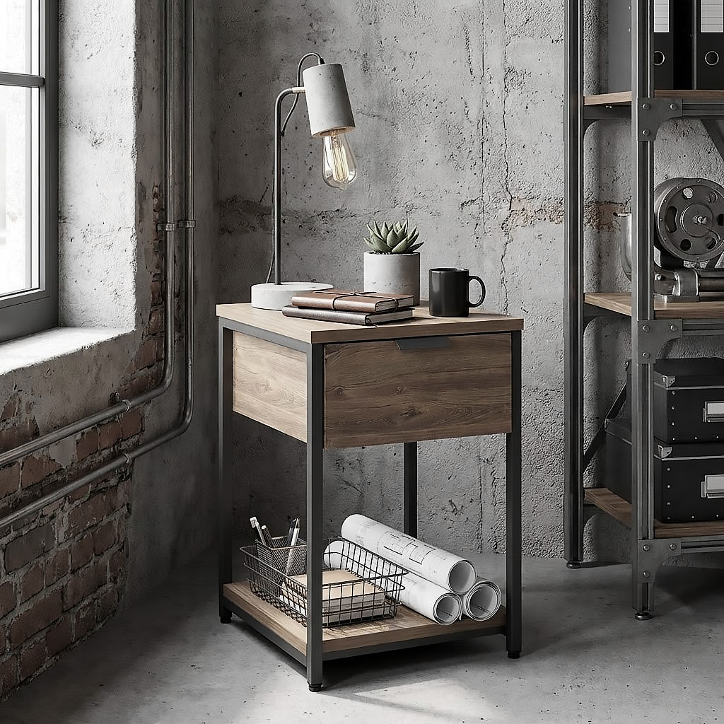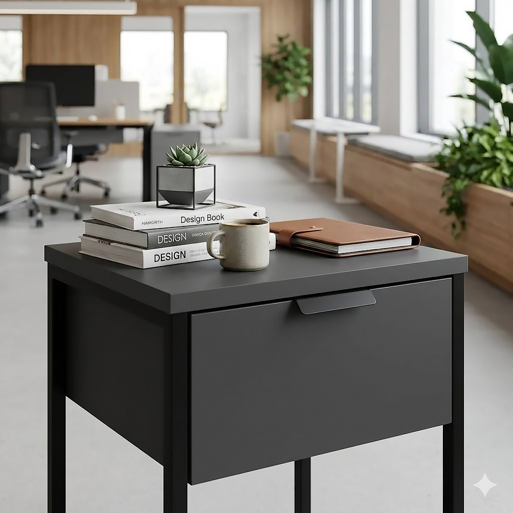 Глубокий выдвижной ящик оснащен надежной фурнитурой для плавного открывания. Верхняя крышка выдерживает нагрузку, достаточную для офисного принтера и других аксессуаров. Нижняя полка создает дополнительное пространство для хранения, сохраняя ощущение "воздуха" в комнате.