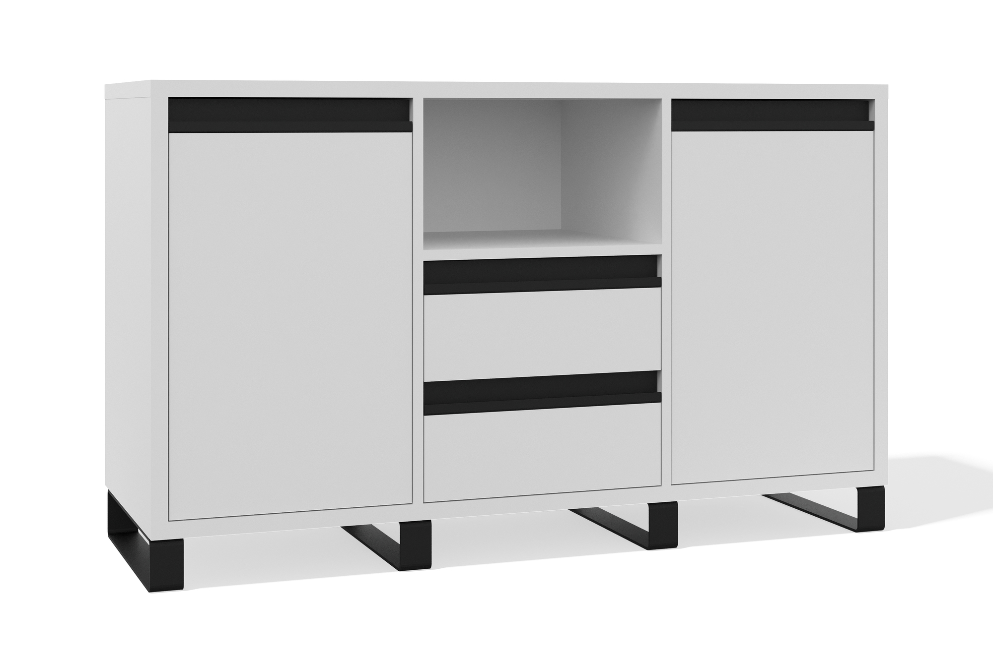 Функциональная и стильная тумба сочетает лаконичный дизайн и продуманную систему хранения. Две вместительные секции с распашными дверцами позволяют разместить крупные предметы, а выдвижные ящики обеспечивают удобный доступ к мелочам. Открытая ниша в центре создаёт дополнительное пространство для хранения и декора.