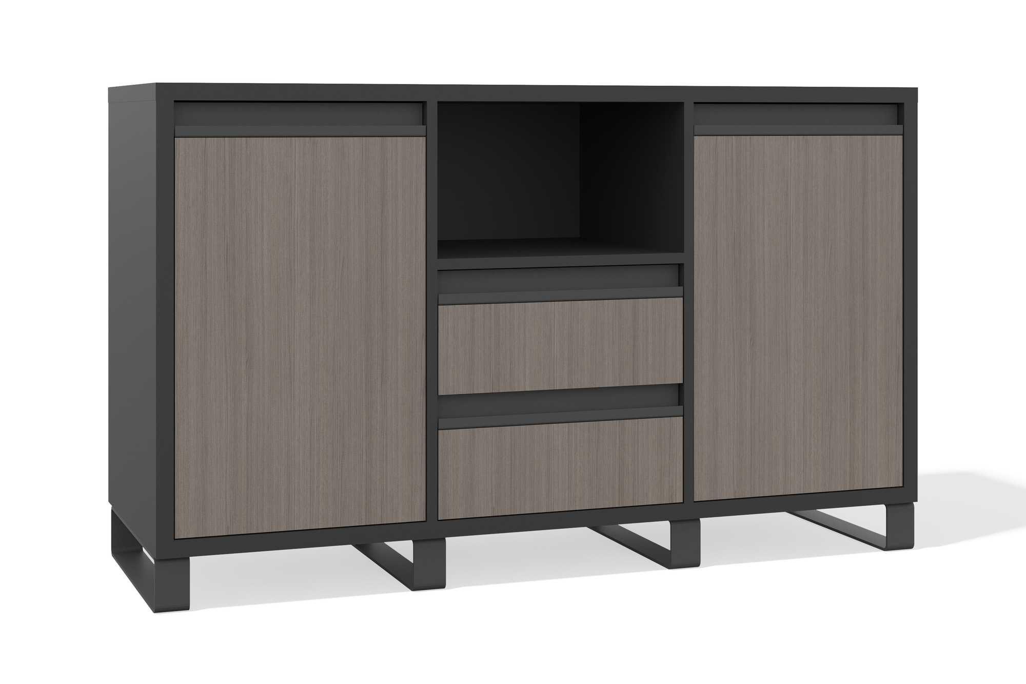 Функциональная и стильная тумба сочетает лаконичный дизайн и продуманную систему хранения. Две вместительные секции с распашными дверцами позволяют разместить крупные предметы, а выдвижные ящики обеспечивают удобный доступ к мелочам. Открытая ниша в центре создаёт дополнительное пространство для хранения и декора.