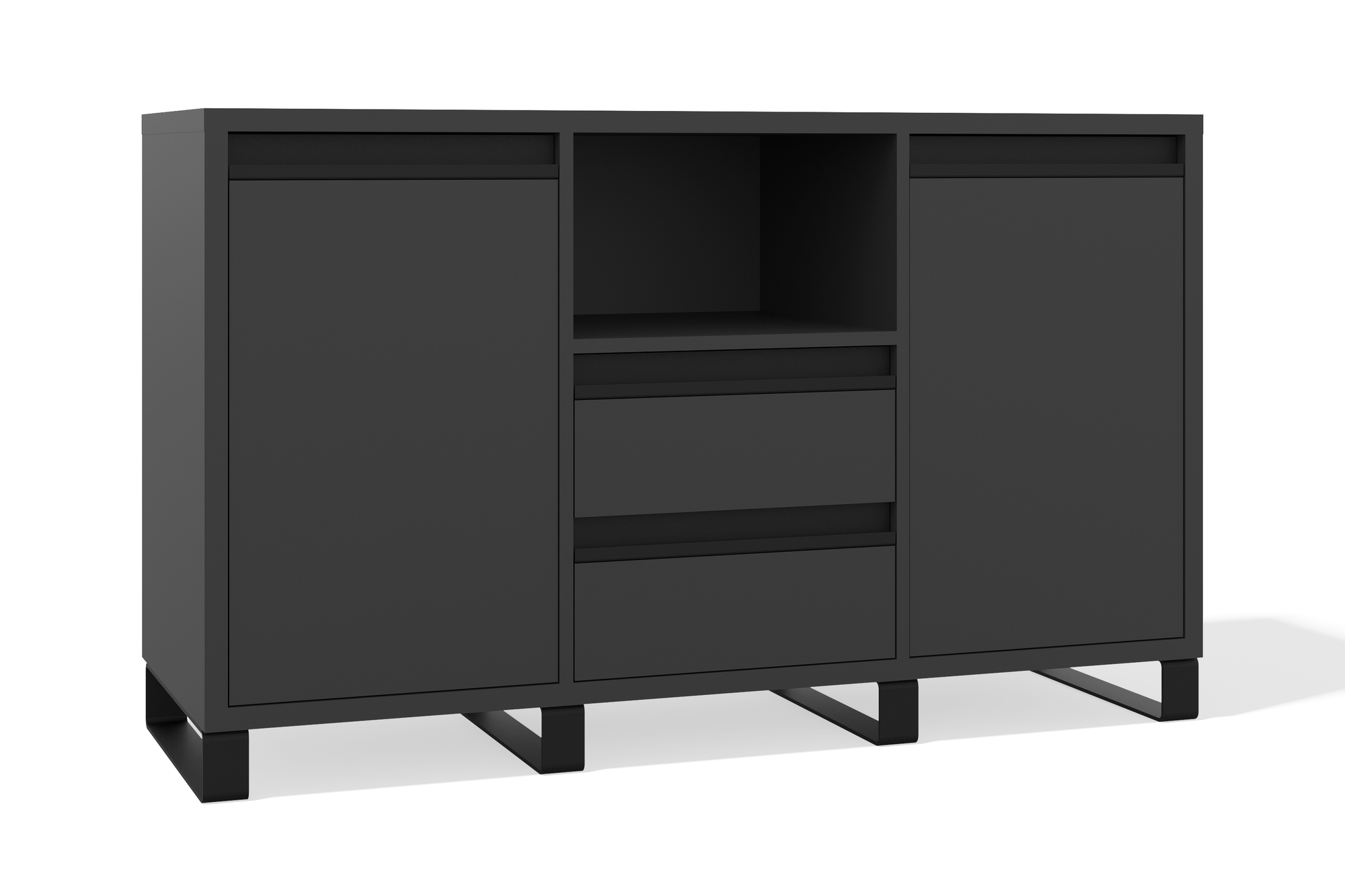 Функциональная и стильная тумба сочетает лаконичный дизайн и продуманную систему хранения. Две вместительные секции с распашными дверцами позволяют разместить крупные предметы, а выдвижные ящики обеспечивают удобный доступ к мелочам. Открытая ниша в центре создаёт дополнительное пространство для хранения и декора.
