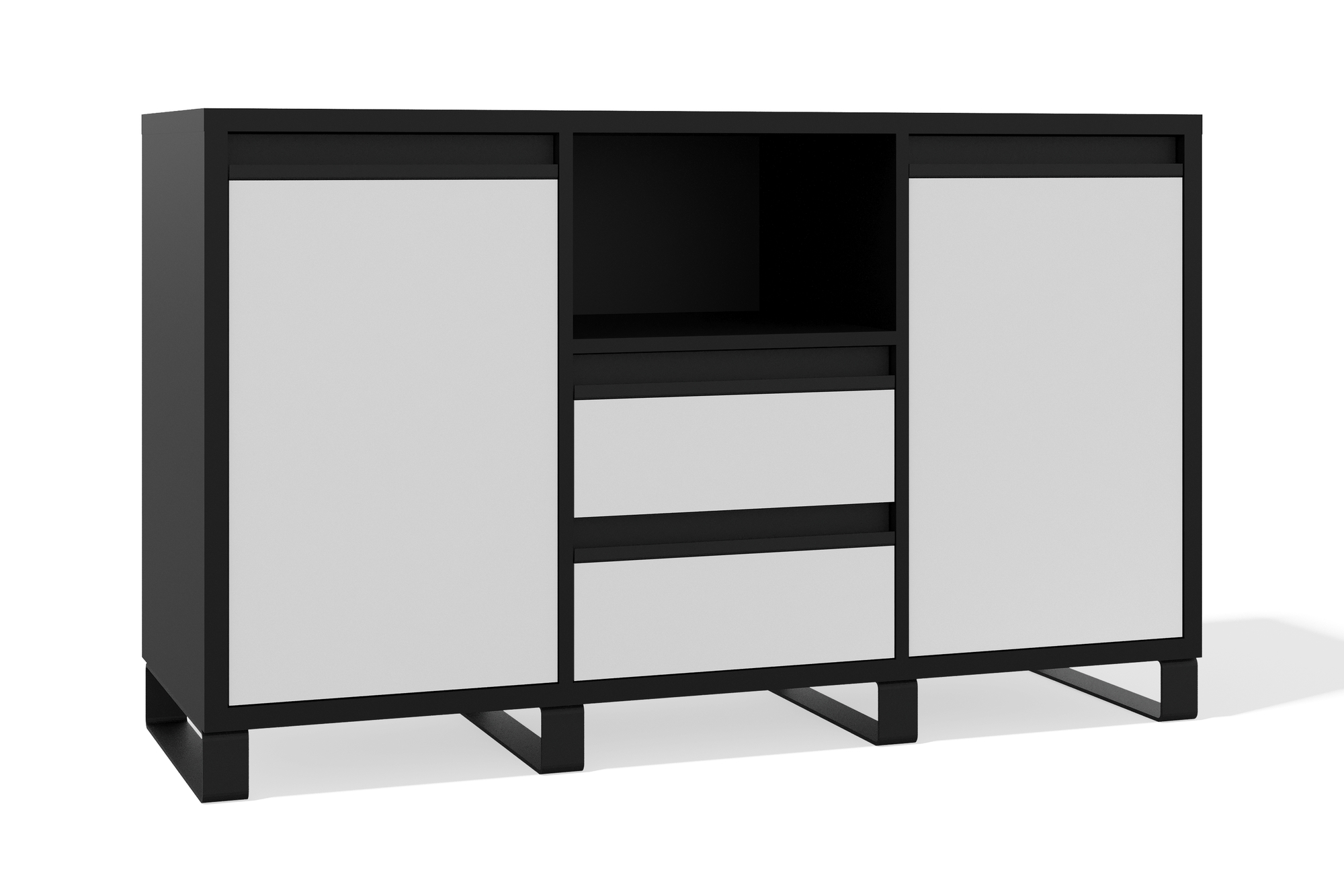 Функциональная и стильная тумба сочетает лаконичный дизайн и продуманную систему хранения. Две вместительные секции с распашными дверцами позволяют разместить крупные предметы, а выдвижные ящики обеспечивают удобный доступ к мелочам. Открытая ниша в центре создаёт дополнительное пространство для хранения и декора.