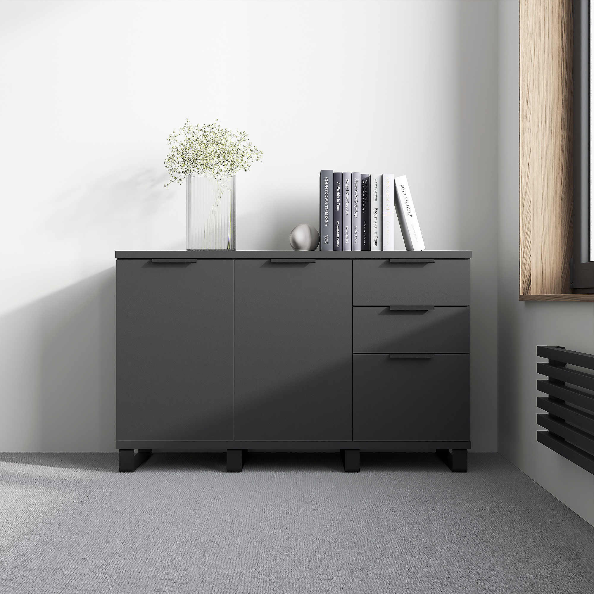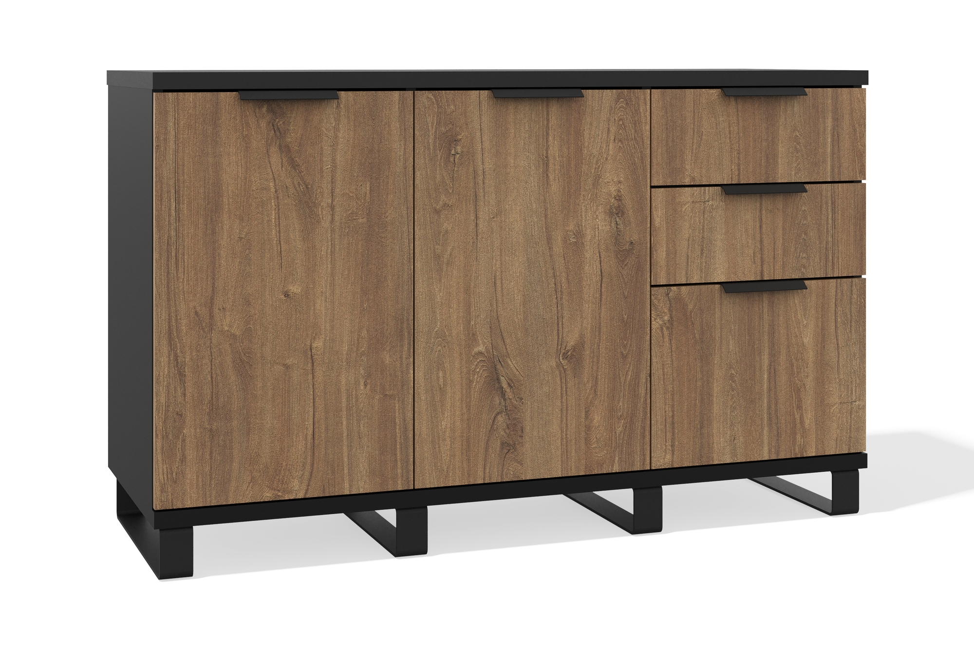 Универсальная тумба с тремя выдвижными ящиками и двумя высокими отсеками с распашными дверцами обеспечивает удобное хранение и порядок в пространстве. Конструкция на прочном металлическом каркасе. Выполнена из высококачественных материалов. Лаконичный дизайн делает её подходящей как для офиса, так и для дома.