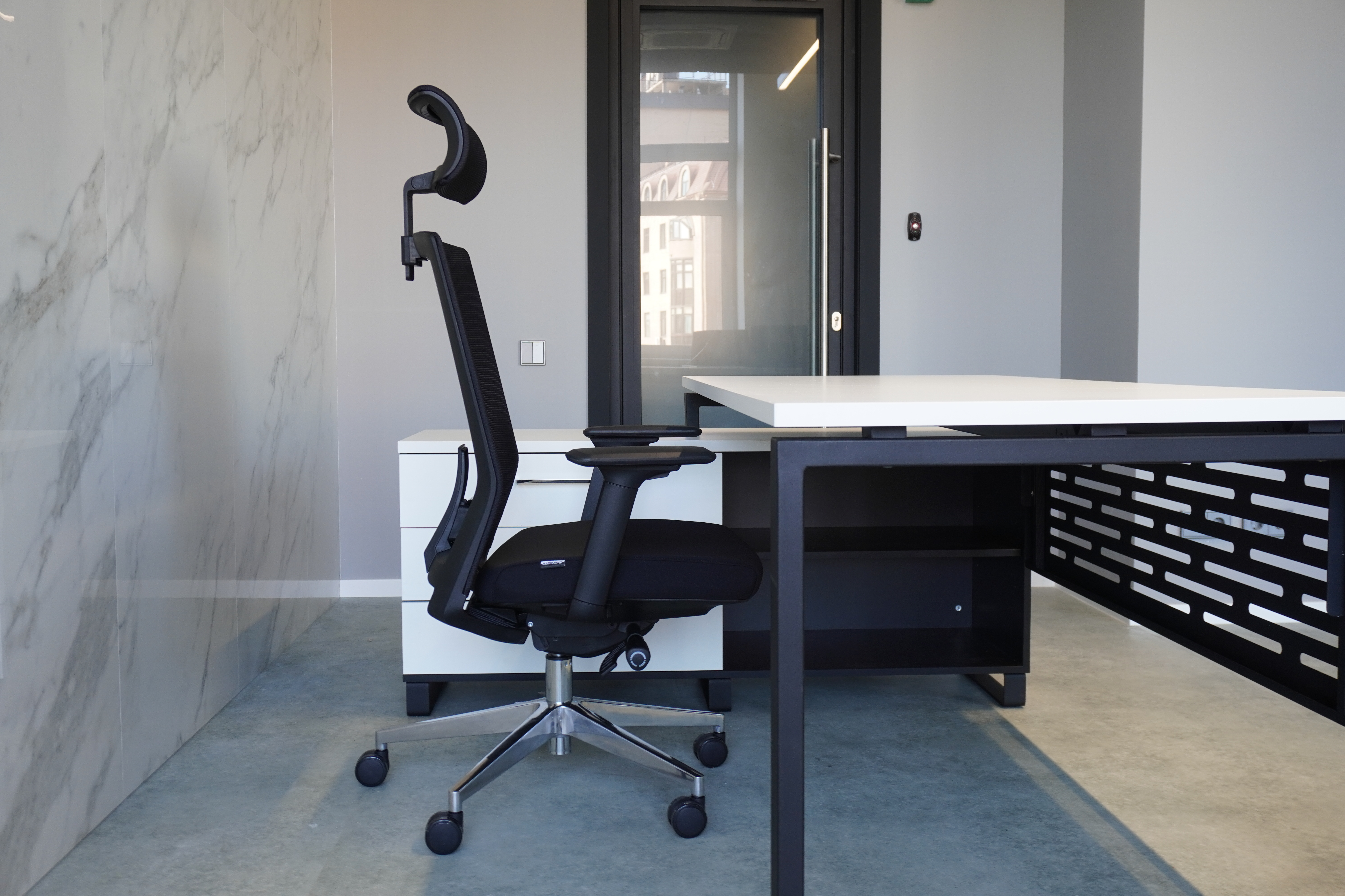 Решение: мы разработали мебель, которая позволяет легко сочетать разные сценарии работы. Бенч-системы обеспечили удобные рабочие места для индивидуальных задач и при этом сохранили открытость пространства. Зона ресепшн задала единый стиль и аккуратный визуальный акцент при входе. Для командных встреч и летучек был создан переговорный стол, а мобильные узкие тумбы и шкафы-купе помогли организовать хранение. Стеллажная система дополнила интерьер, сохранив лёгкость и функциональность. Вся мебель выполнена в чёрно-белой гамме, что подчёркивает современный характер офиса.
